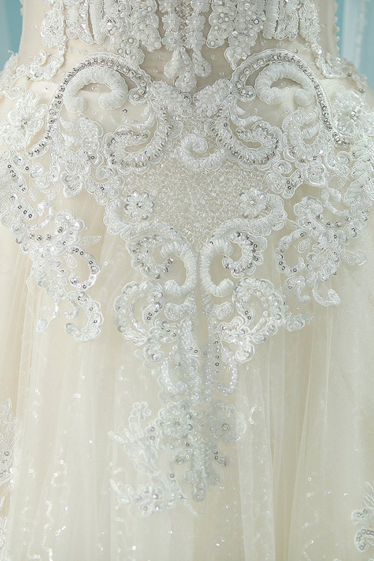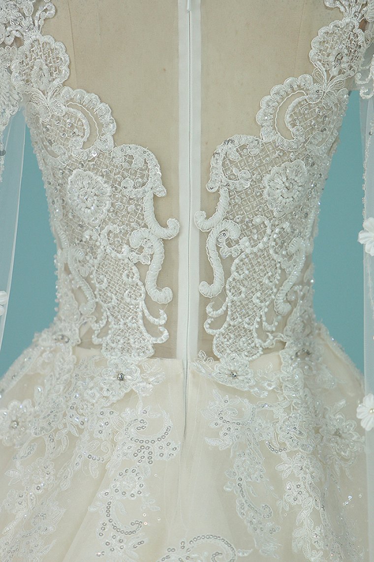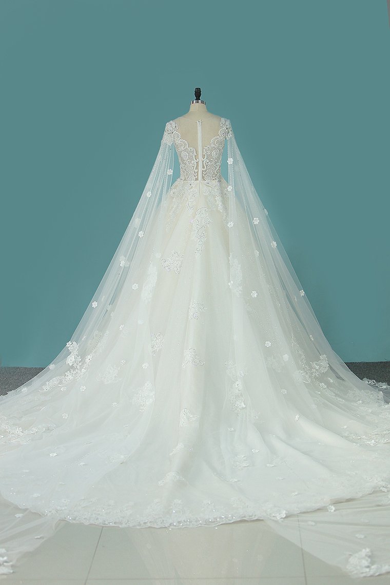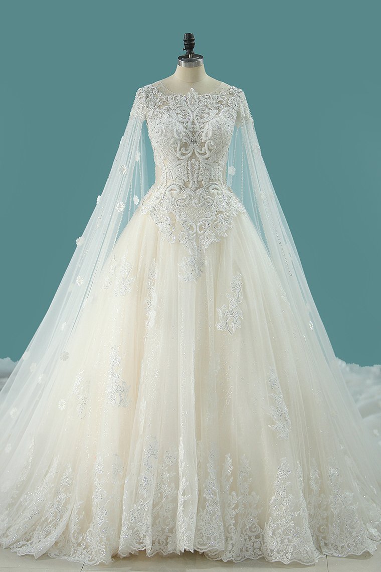 2024 Luxurious Scoop Wedding Dresses A Line Tulle With Appliques And Beading Royal Train