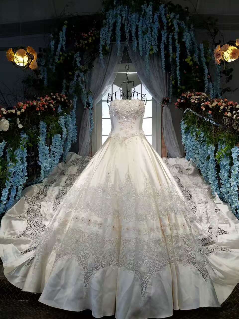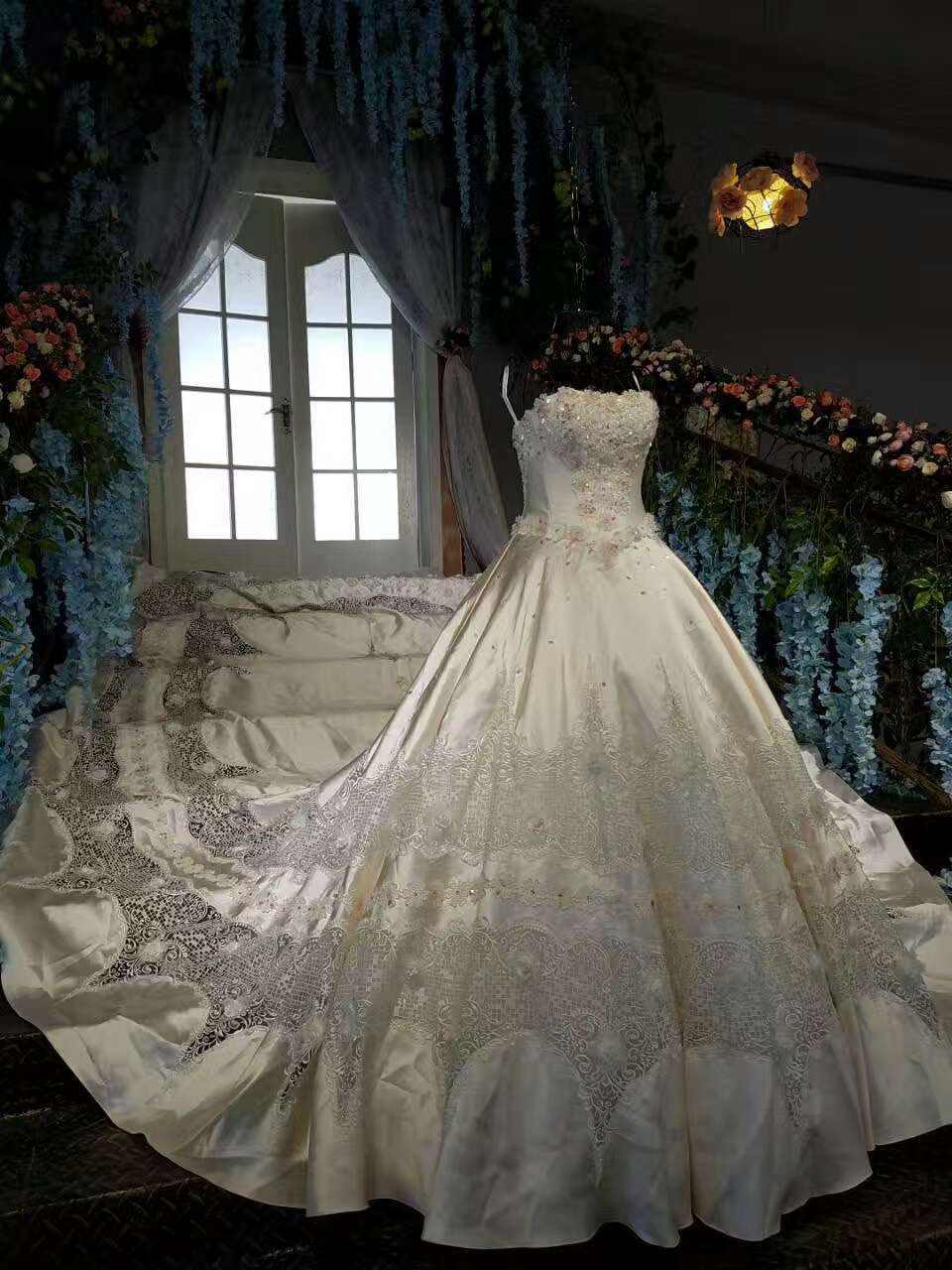 2024 Marvelous High-End Satin Strapless Wedding Dresses Lace Up With Beads Royal Train