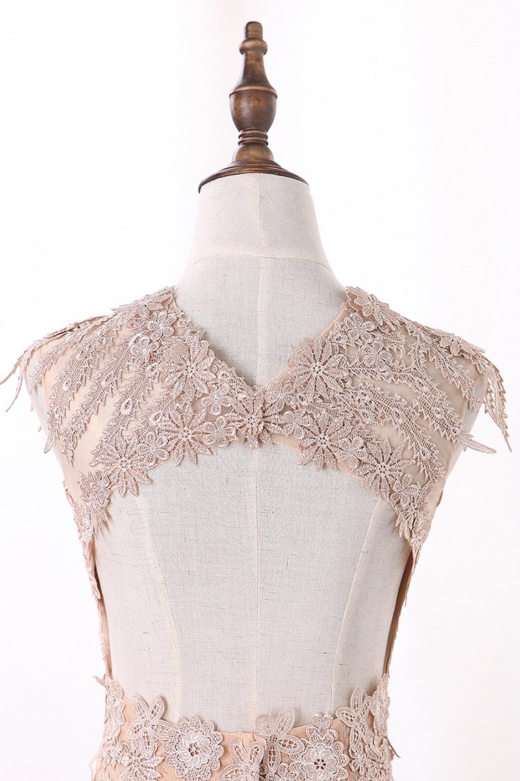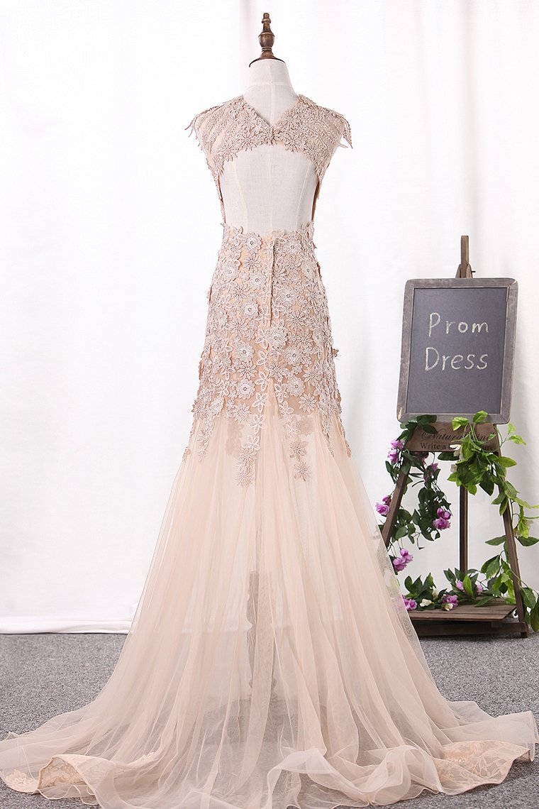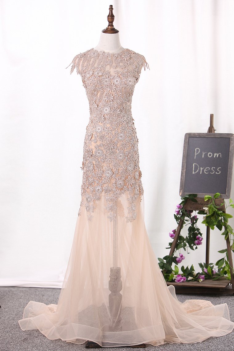 2024 Mermaid Scoop Wedding Dresses Tulle With Applique Court Train Open Back