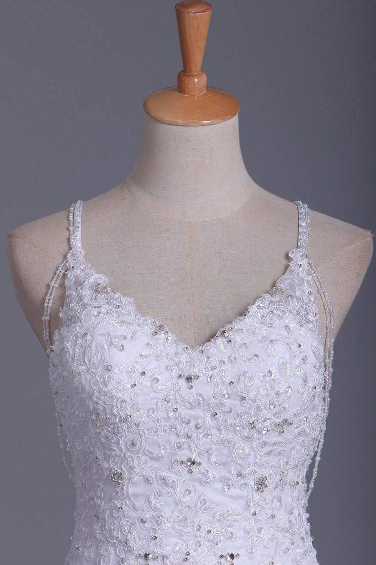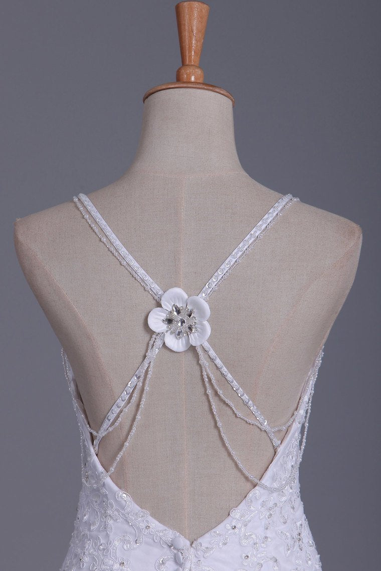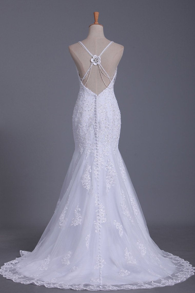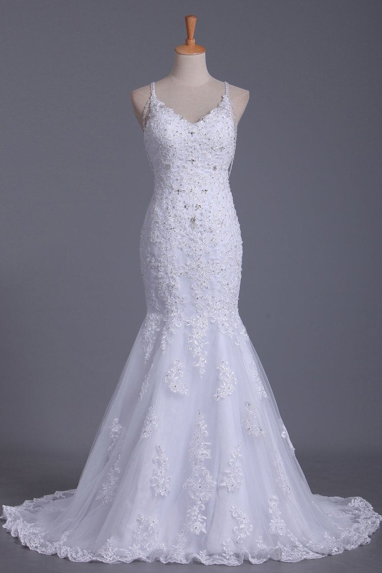 2024 Mermaid Spaghetti Straps Open Back Tulle With Applique And Beads Wedding Dresses