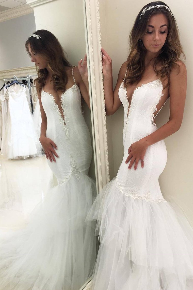 2024 Mermaid Spaghetti Straps Wedding Dresses Tulle With Applique And Beads