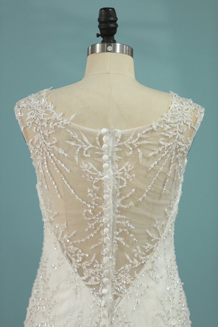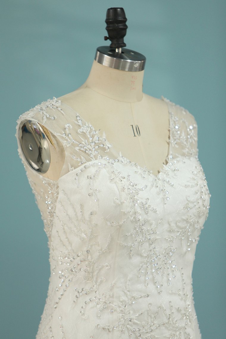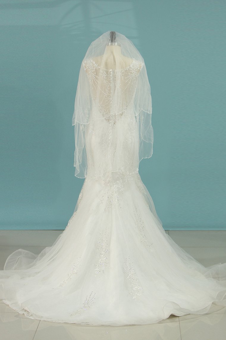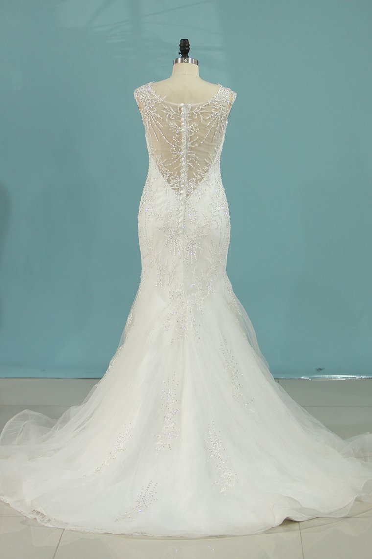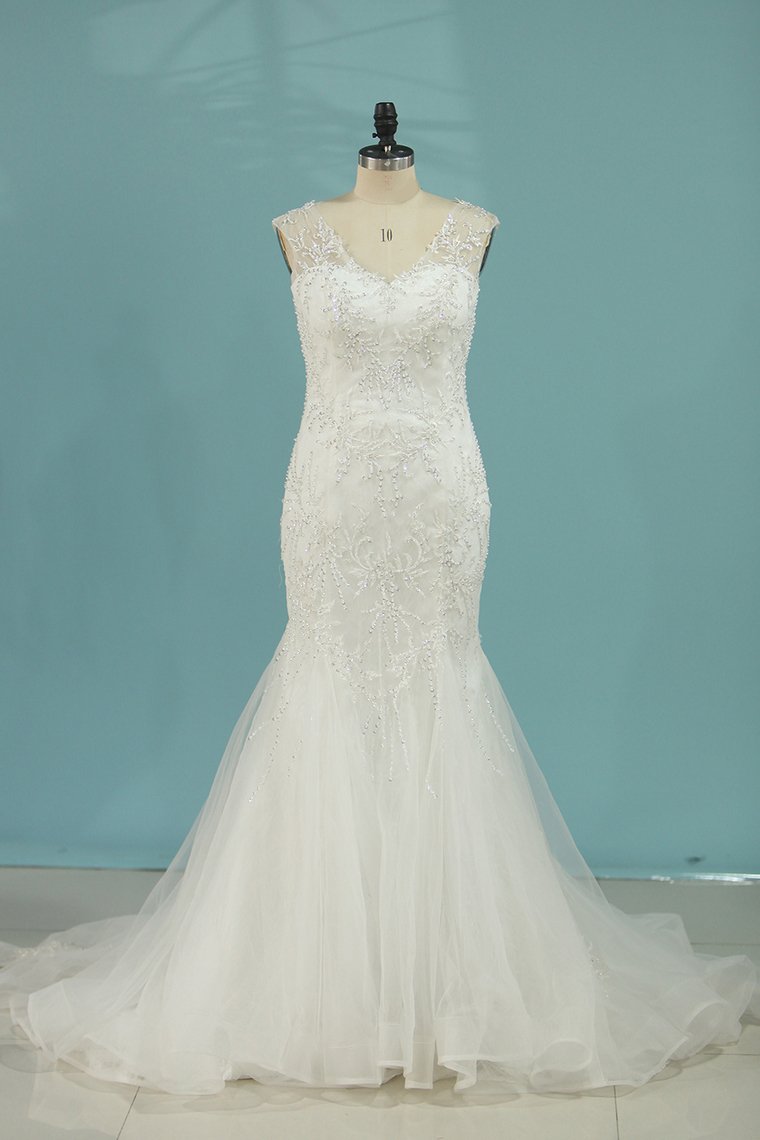 2024 Mermaid/Trumpet Wedding Dresses V-Neck Chapel Train Tulle With Applique Sleeveless