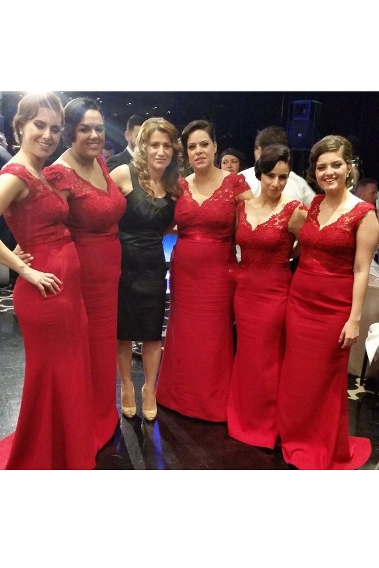 2024 Mermaid V Neck Satin With Applique Sweep Train Bridesmaid Dresses
