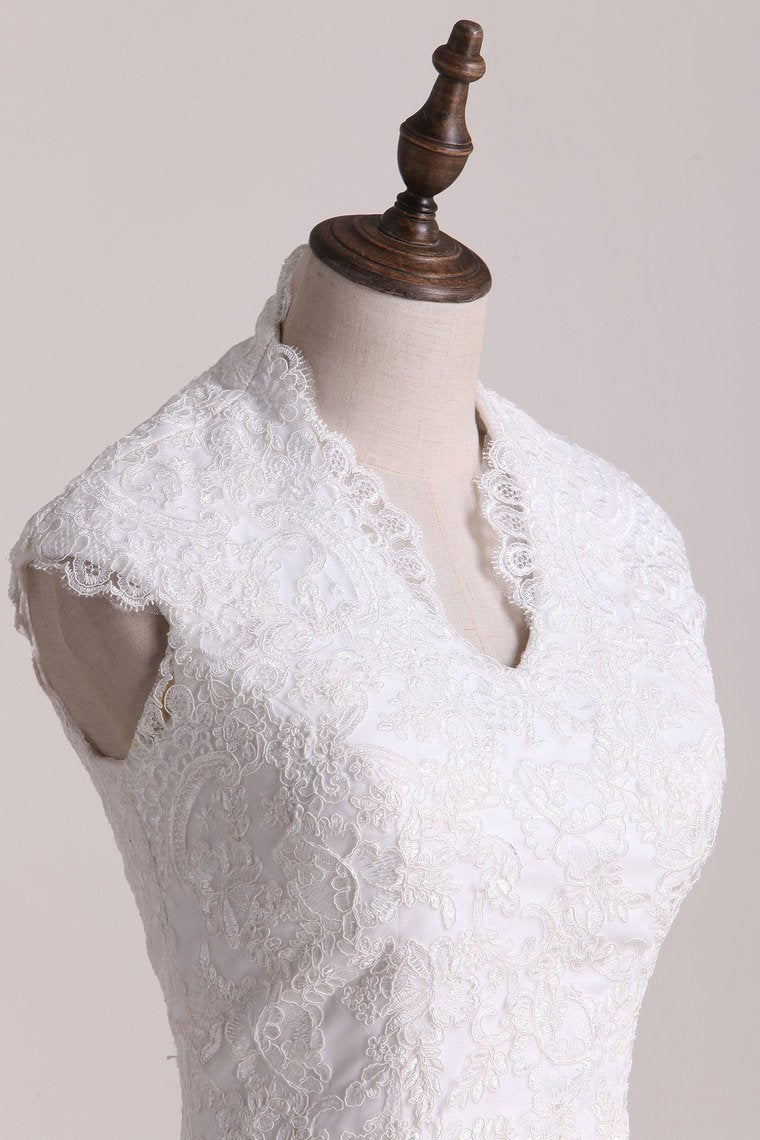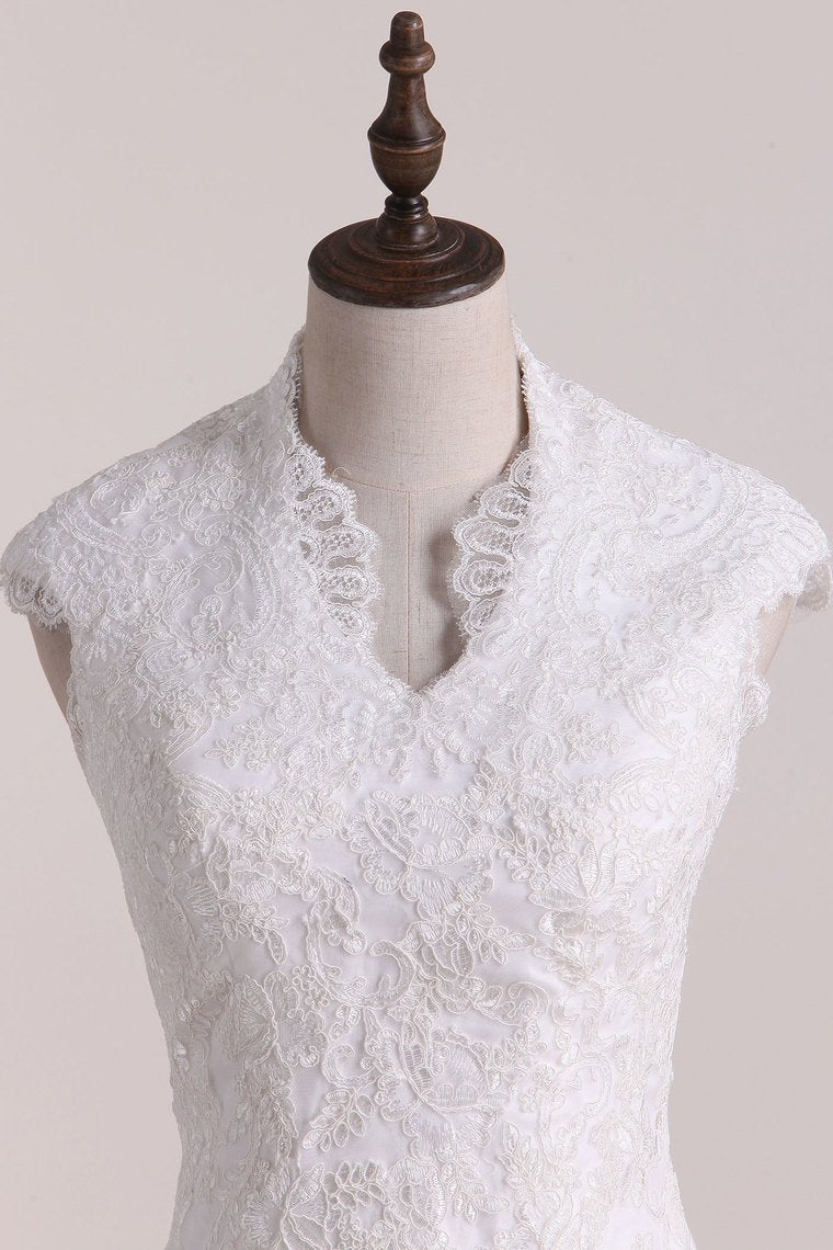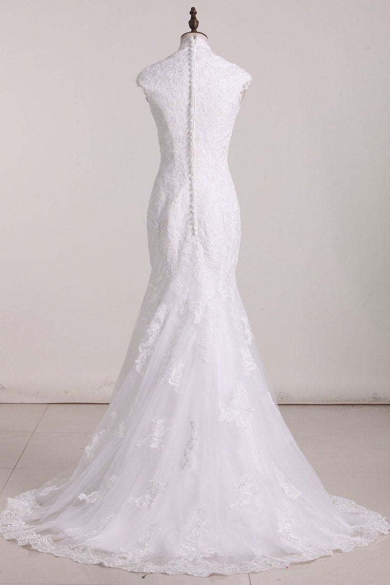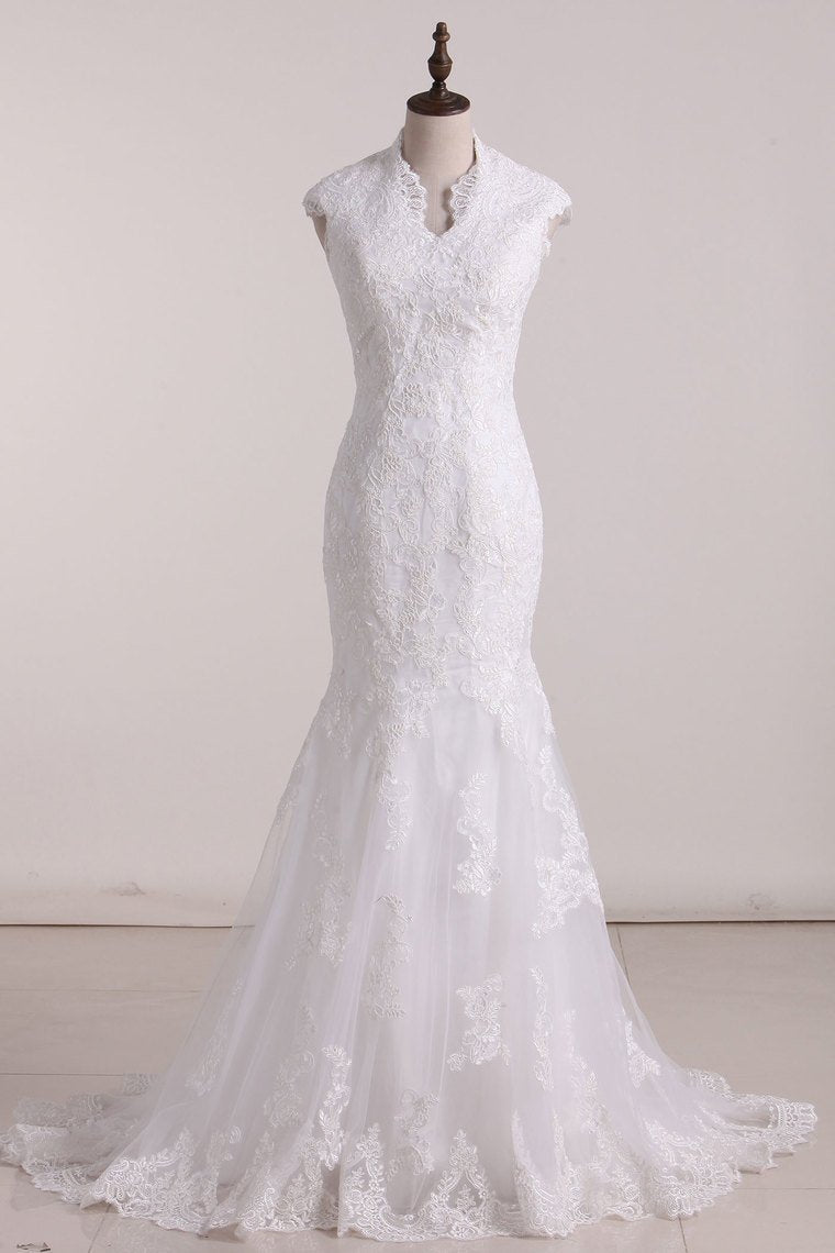 2024 Mermaid V Neck Wedding Dresses Tulle With Applique And Sash Sweep Train