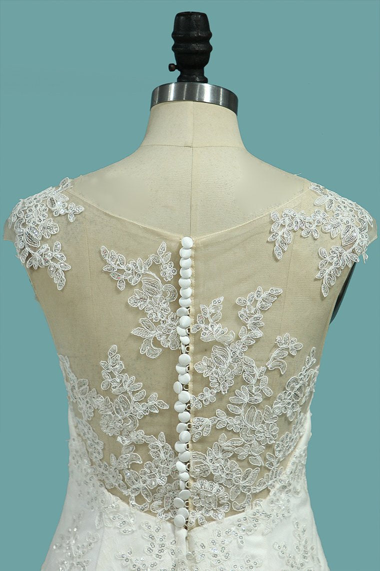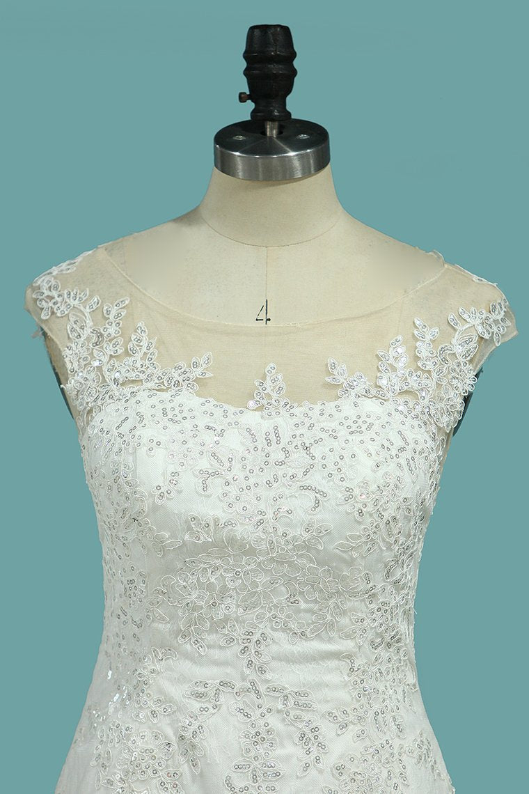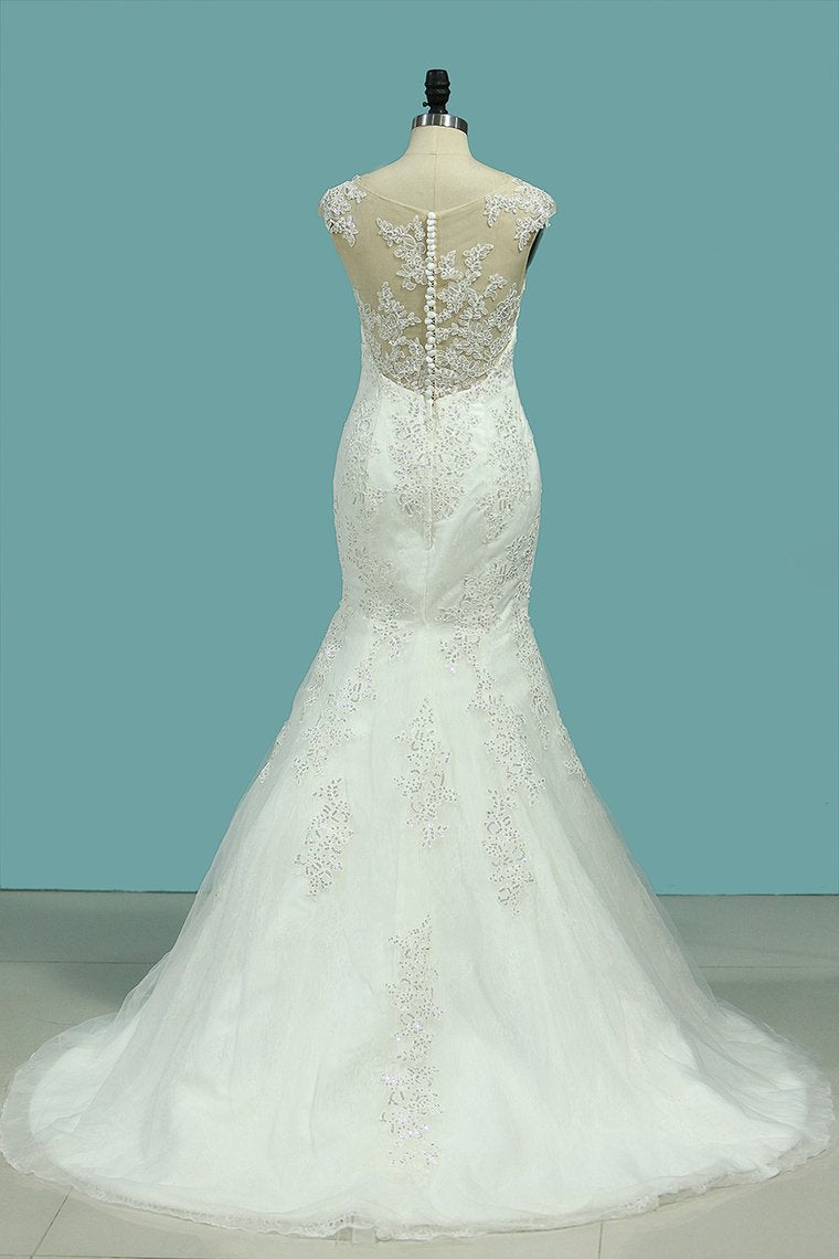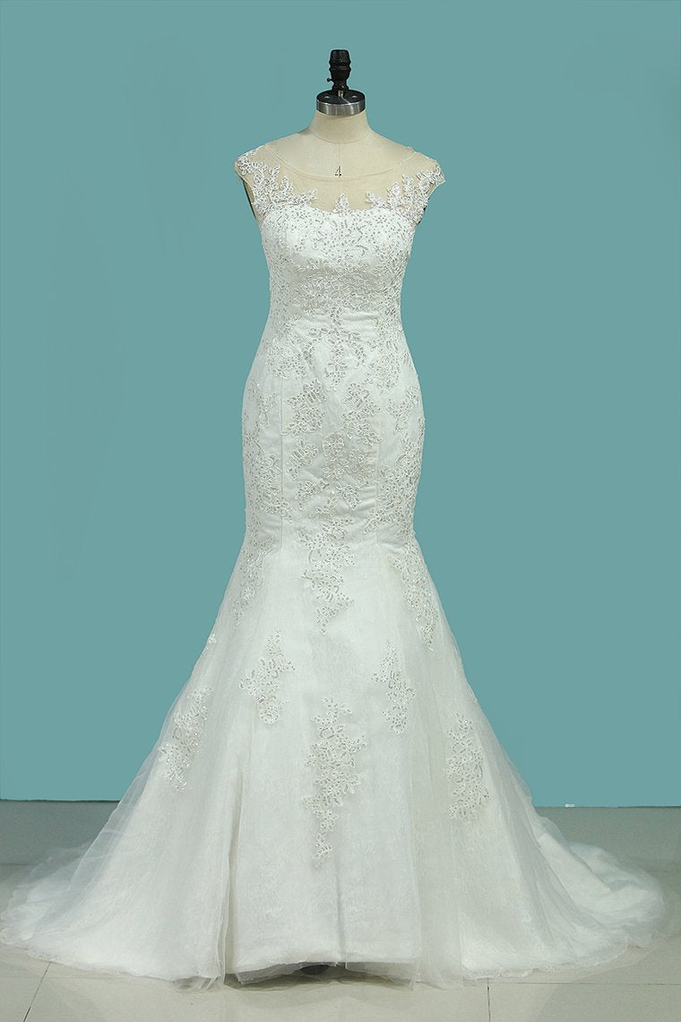 2024 Mermaid Wedding Dresses Tulle Scoop With Applique And Beads Court Train