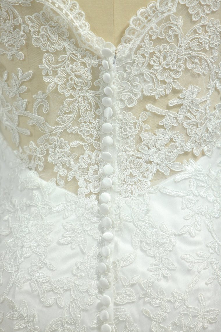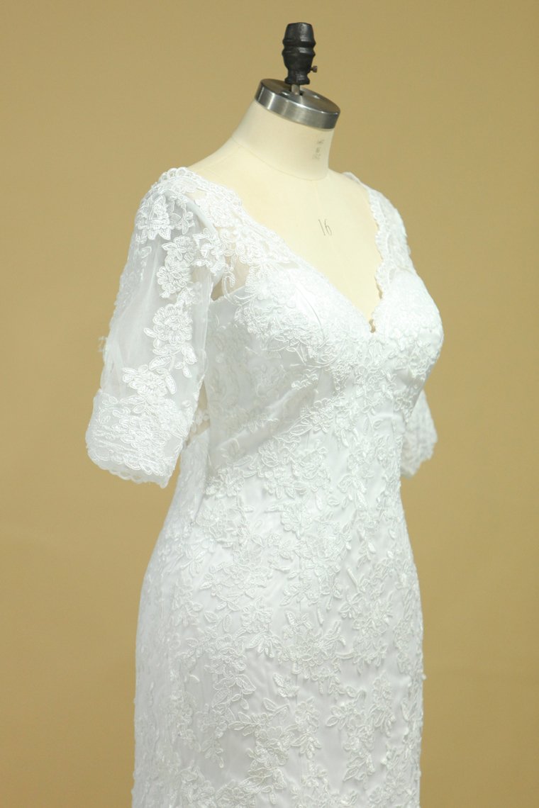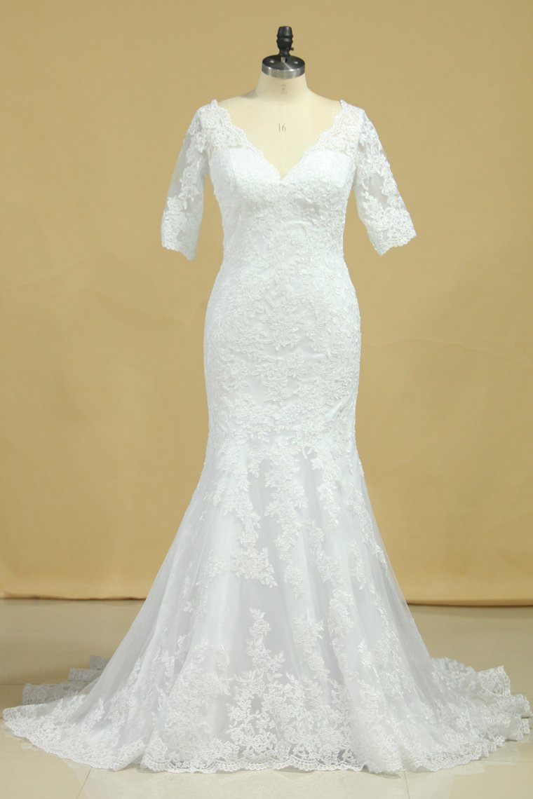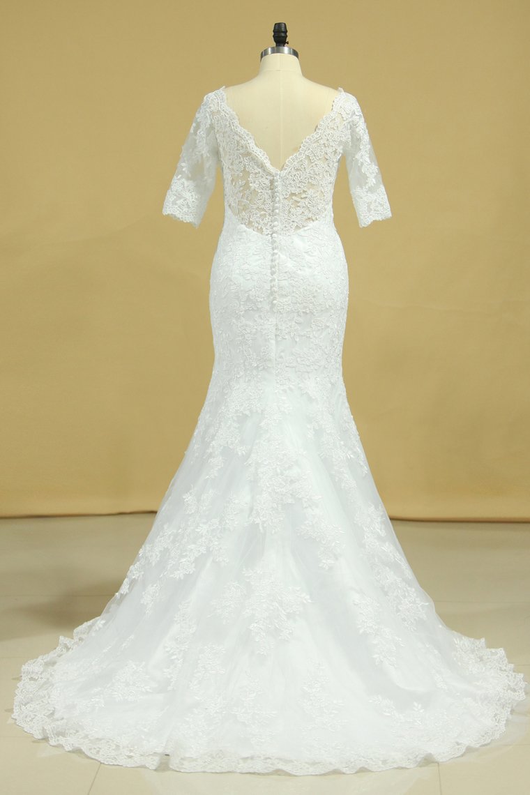 2024 Mermaid Wedding Dresses V-Neck 3/4 Sleeves Court Train Tulle V-Back With Covered Button