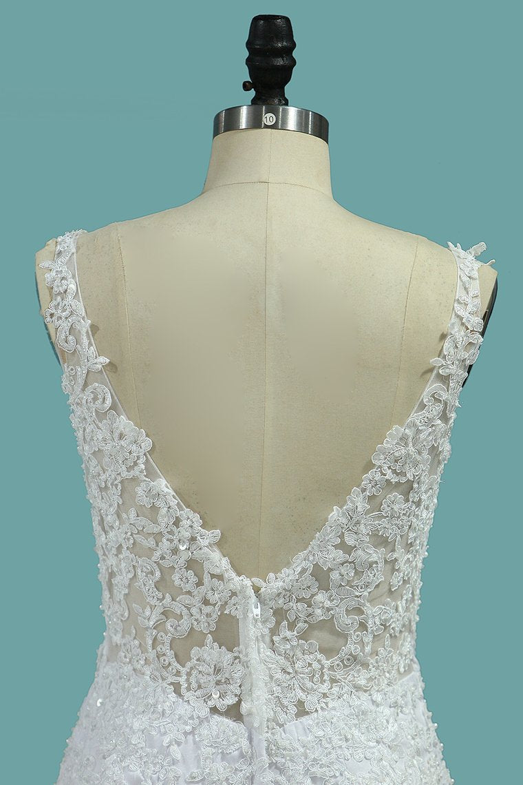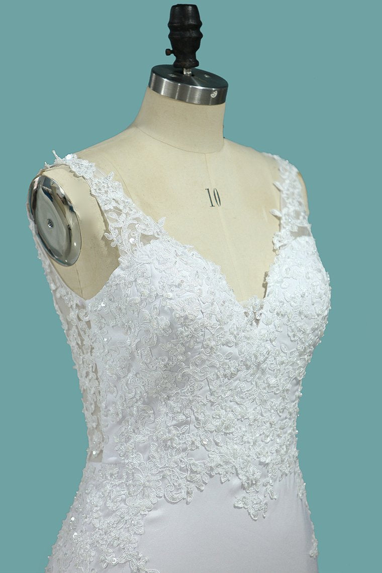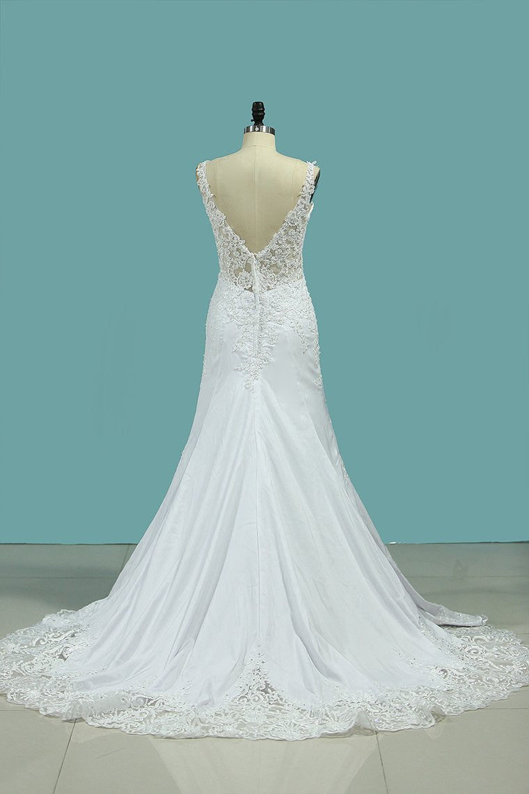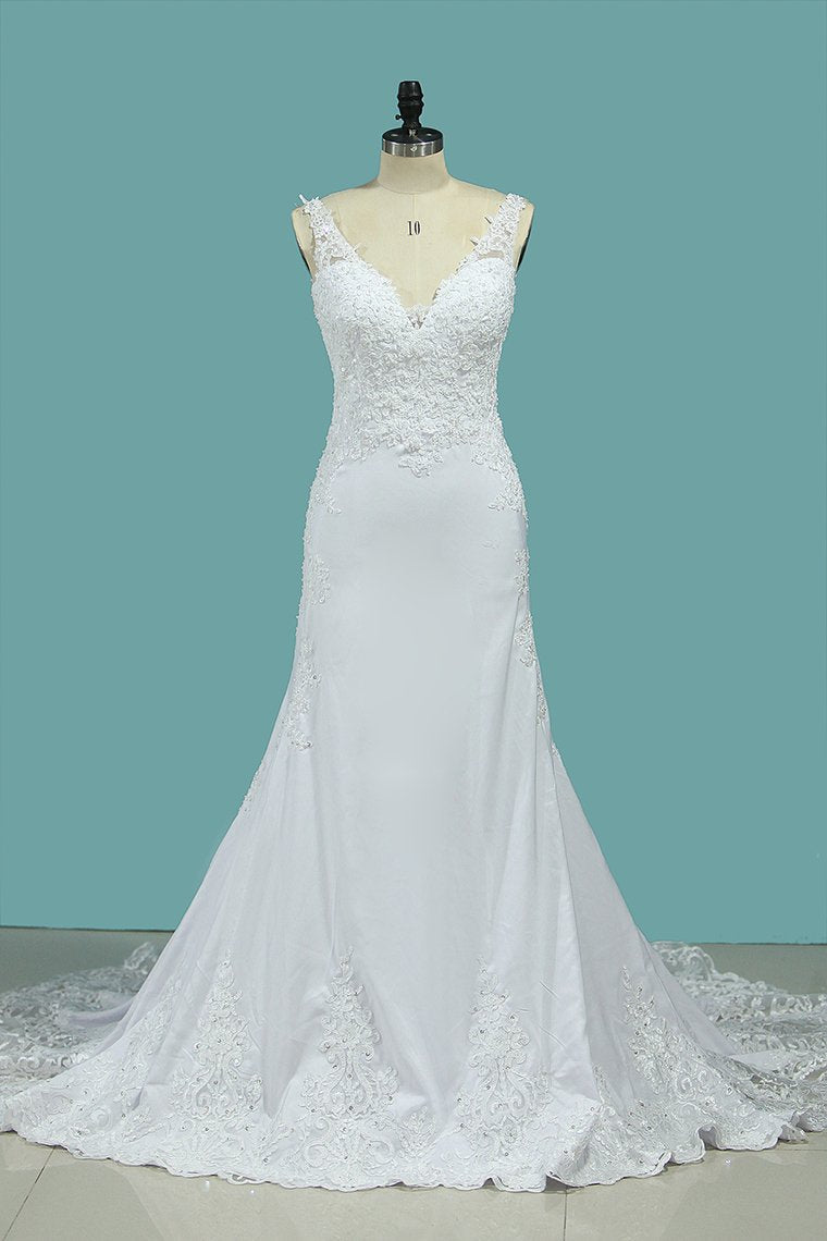 2024 Mermaid Wedding Dresses V Neck Open Back Elastic Satin With Applique