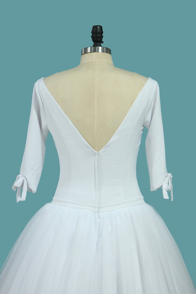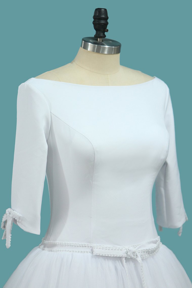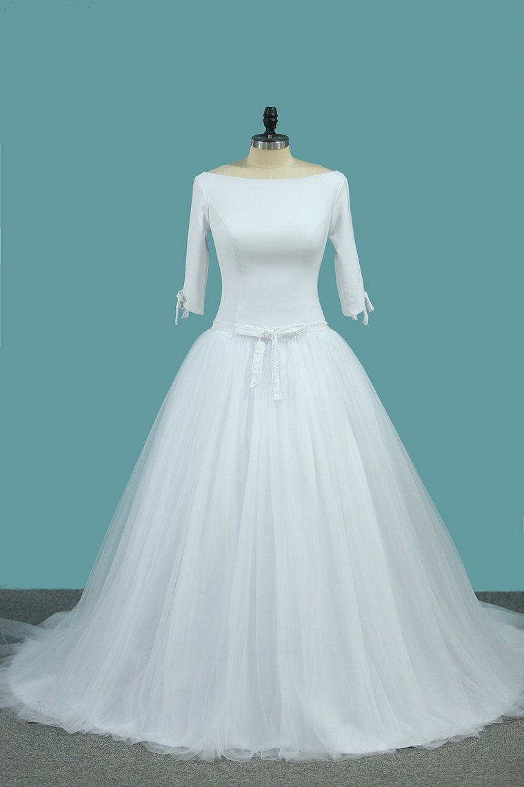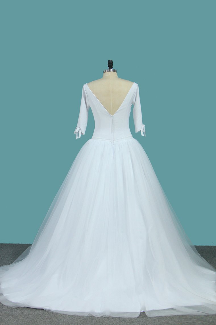 2024 Mid-Length Sleeves Scoop A Line Wedding Dresses Tulle Chapel Train
