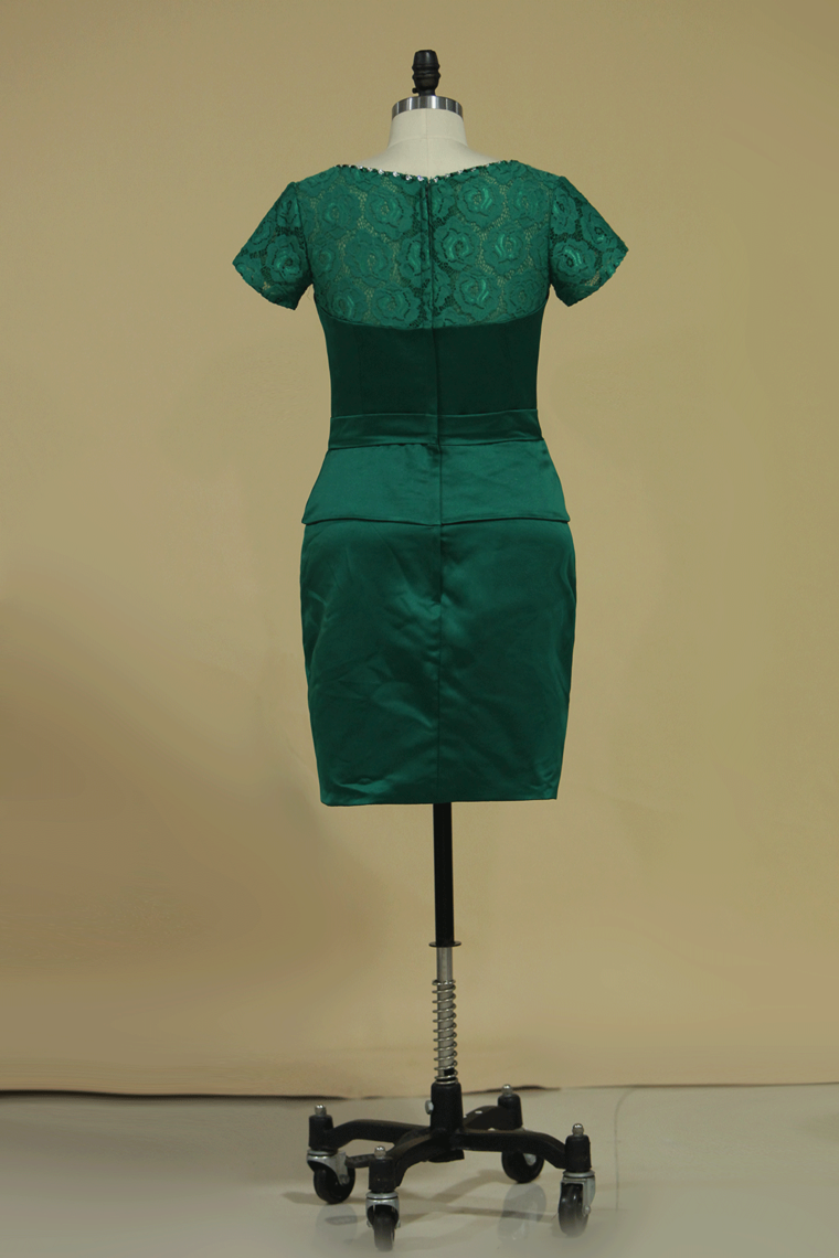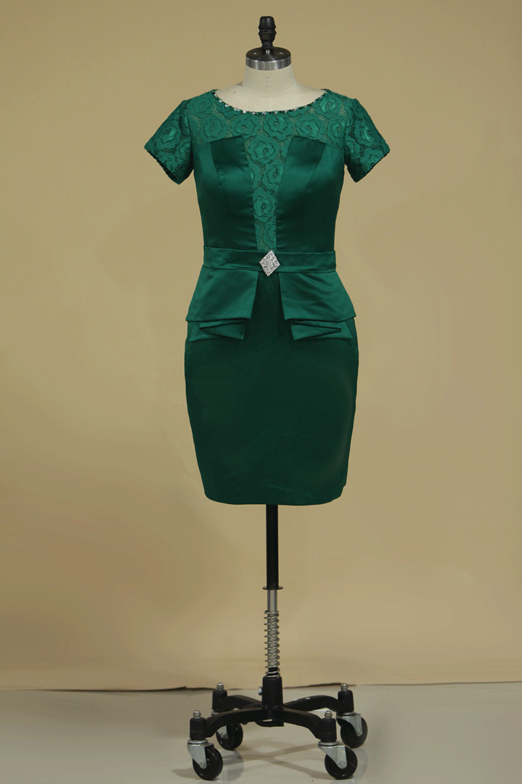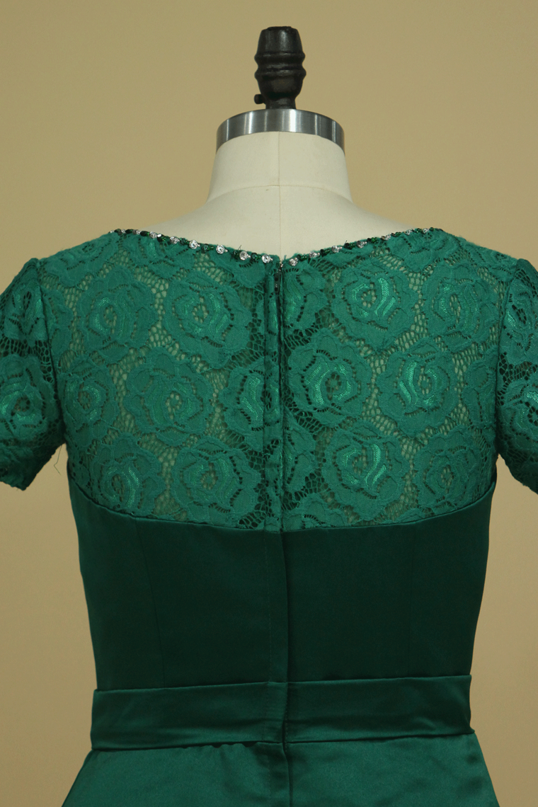 2024 Mother Of The Bride Dresses Bateau Short Sleeves Satin & Lace With Beads & Sash