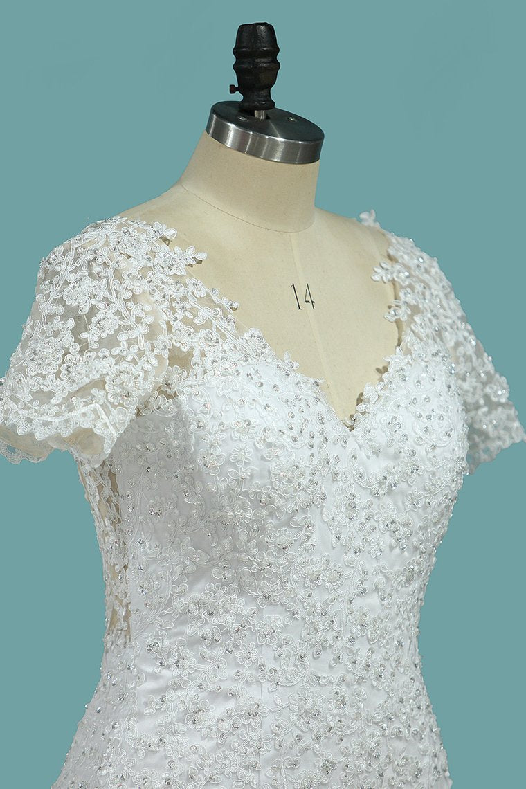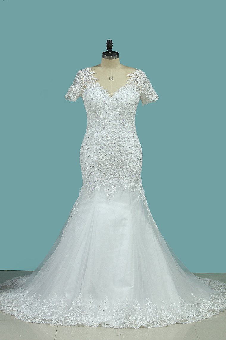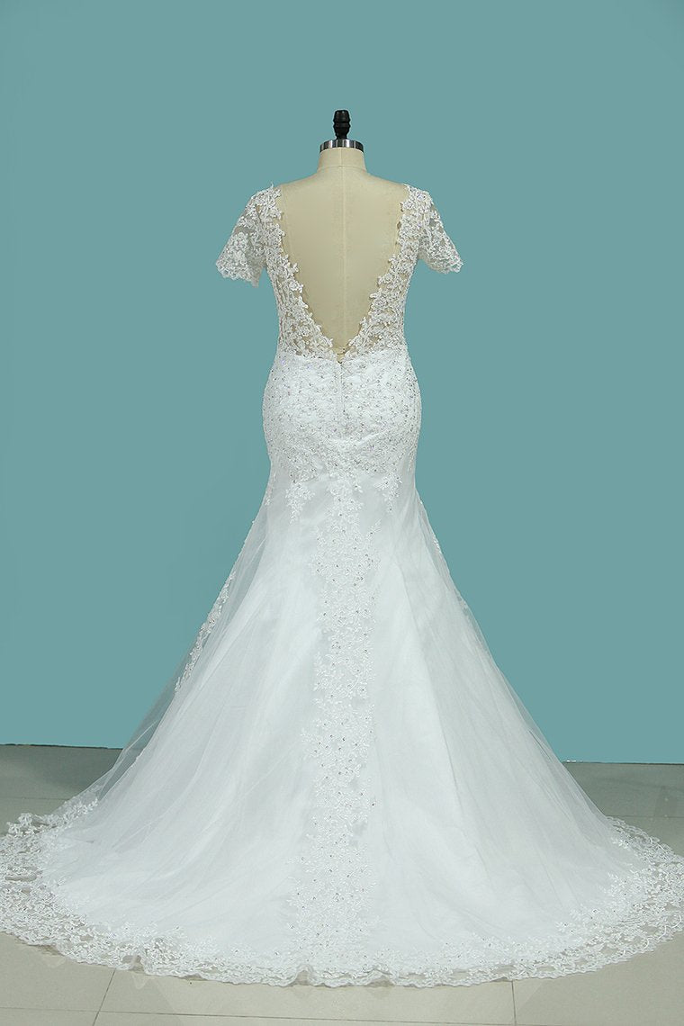 2024 New Arrival Mermaid/Trumpet Wedding Dresses V-Neck Tulle With Applique Short Sleeves