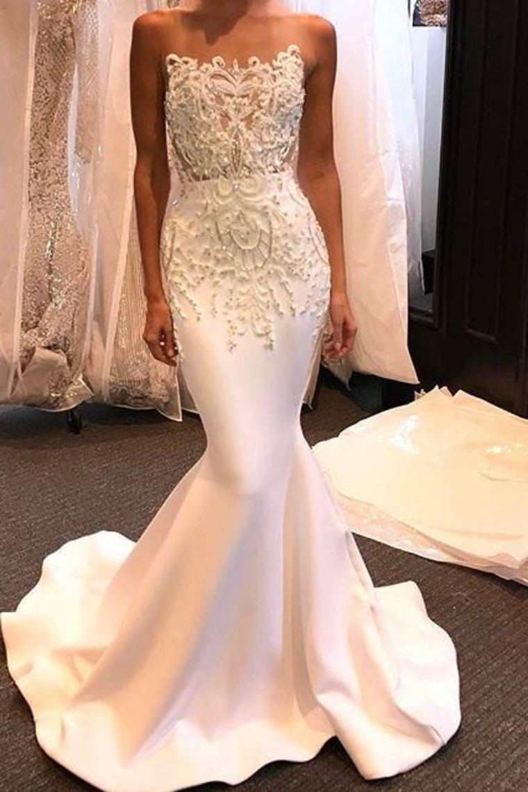 2024 New Arrival Satin Wedding Dresses Mermaid Scoop With Appliques And Beads