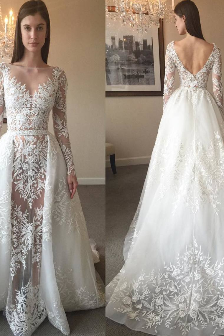2024 New Arrival Scoop Neck Wedding Dresses See Through Tulle With Applique & Beading Detachable Skirt Long Sleeves