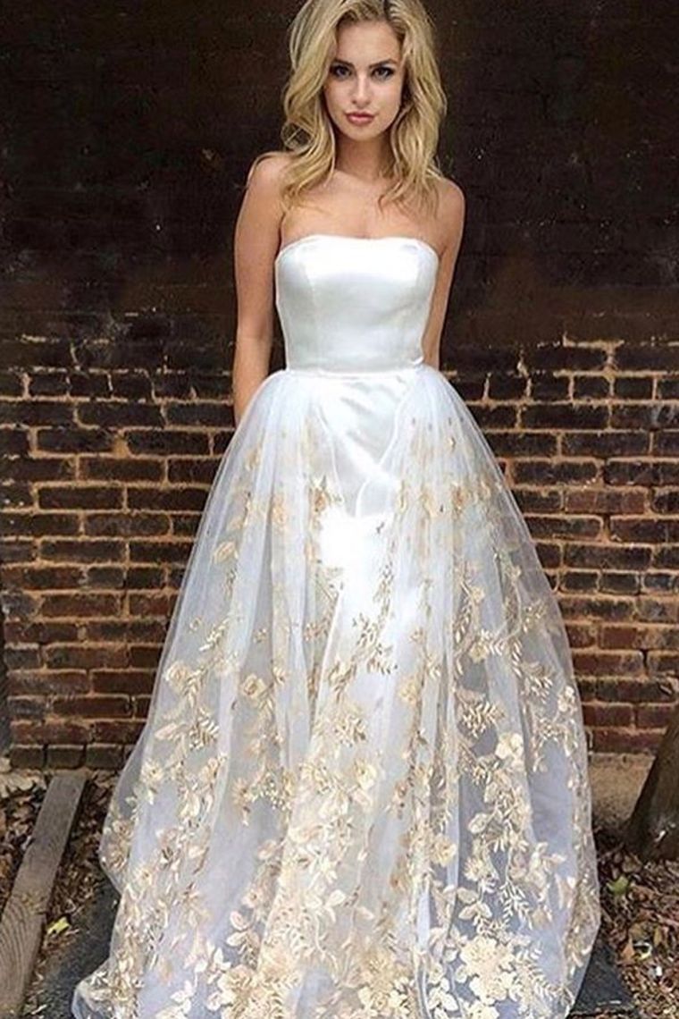 2024 New Arrival Strapless A Line Wedding Dresses Satin With Detachable Skirt Appliques