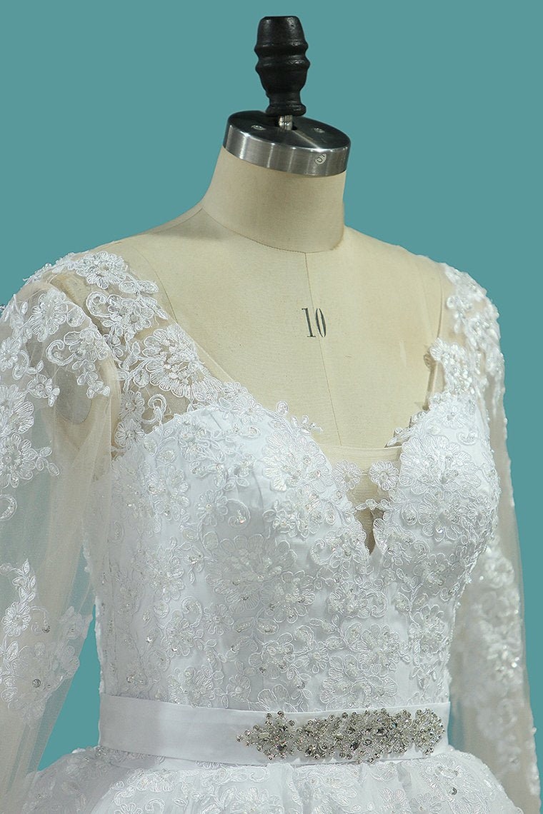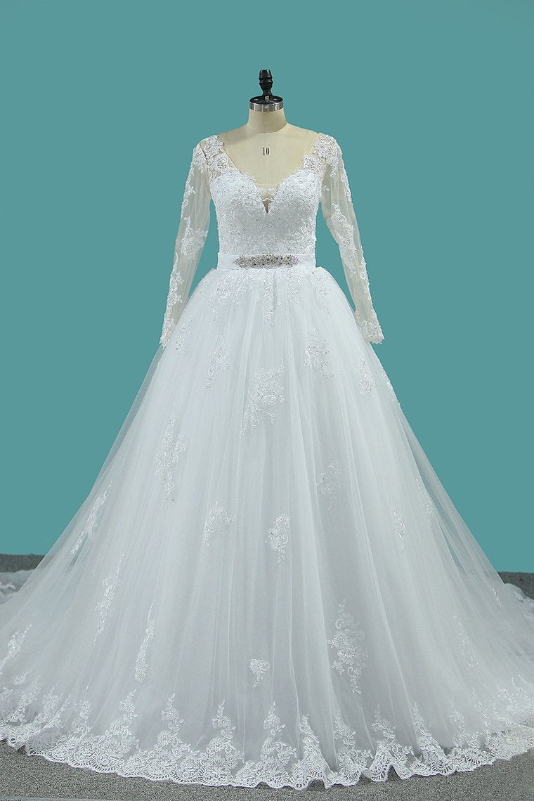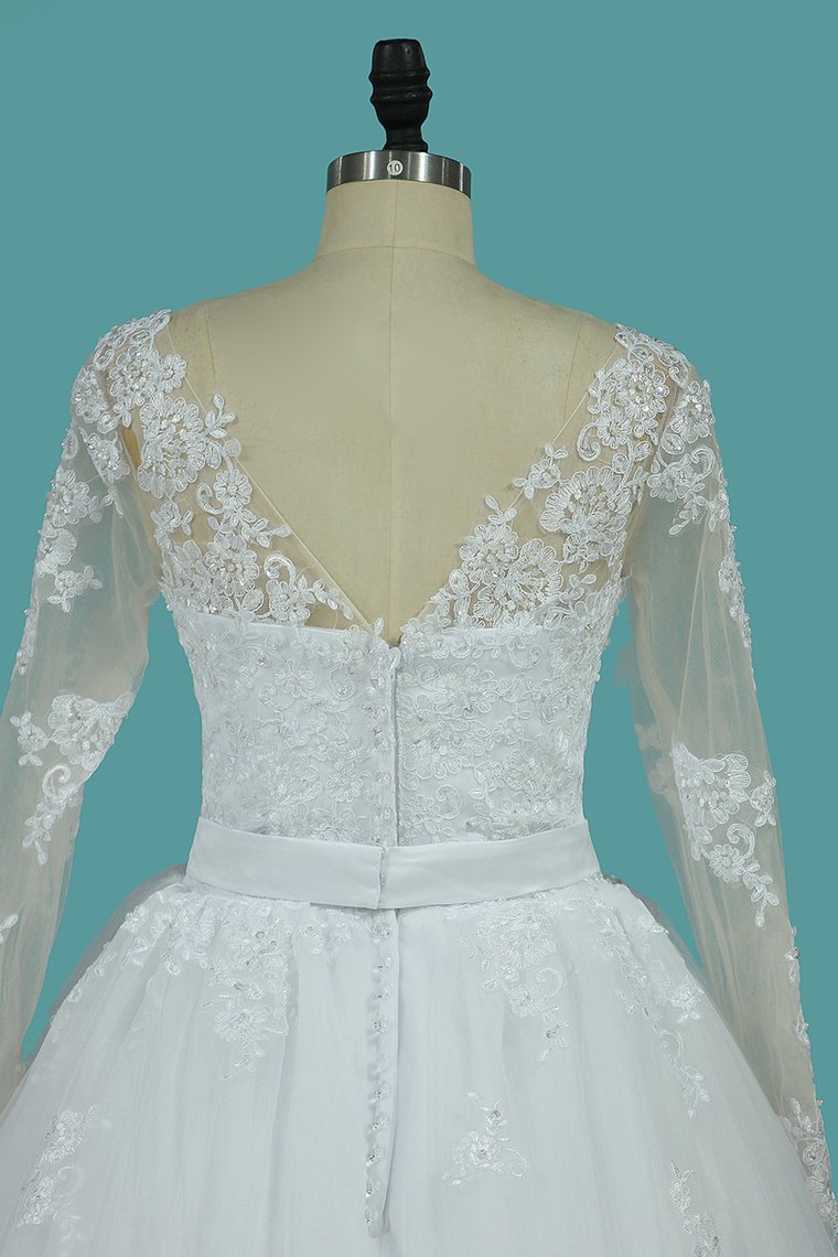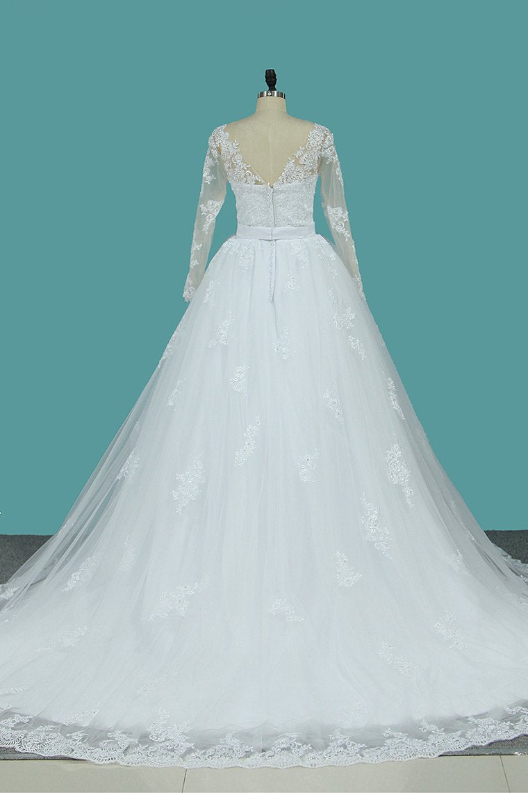 2024 New Arrival V Neck Long Sleeves Tulle Wedding Dresses A Line With Applique
