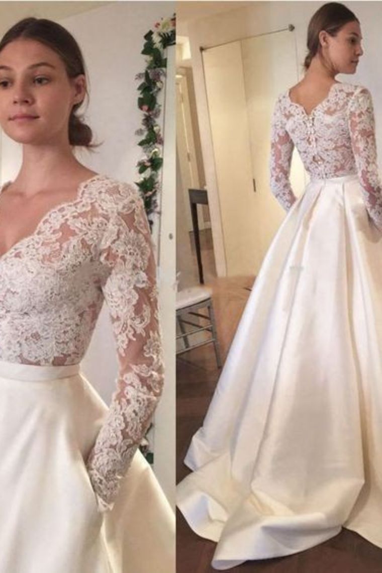 2024 New Arrival Wedding Dresses A-Line V-Neck Long Sleeves Satin Skirt With Applique AndPockets
