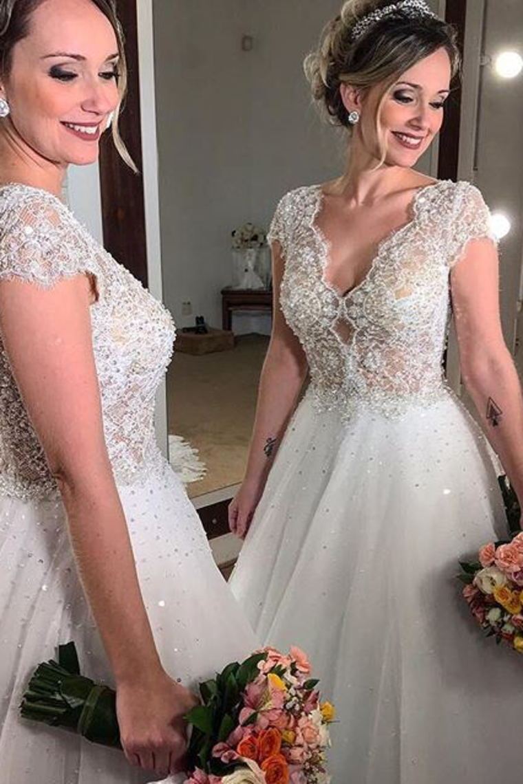 2024 New Arrival Wedding Dresses A-Line V-Neck With Appliques Short Sleeves