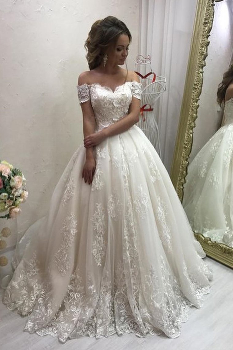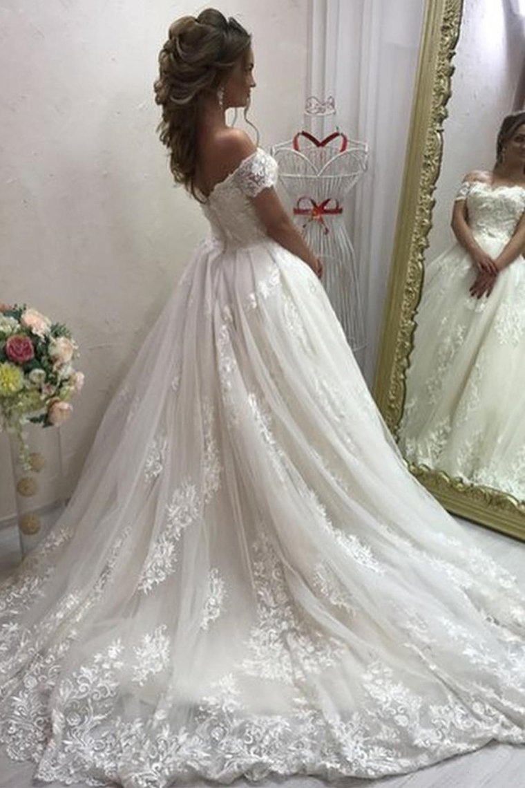 2024 Off The Shoulder A Line Wedding Dresses Tulle With Applique Court Train