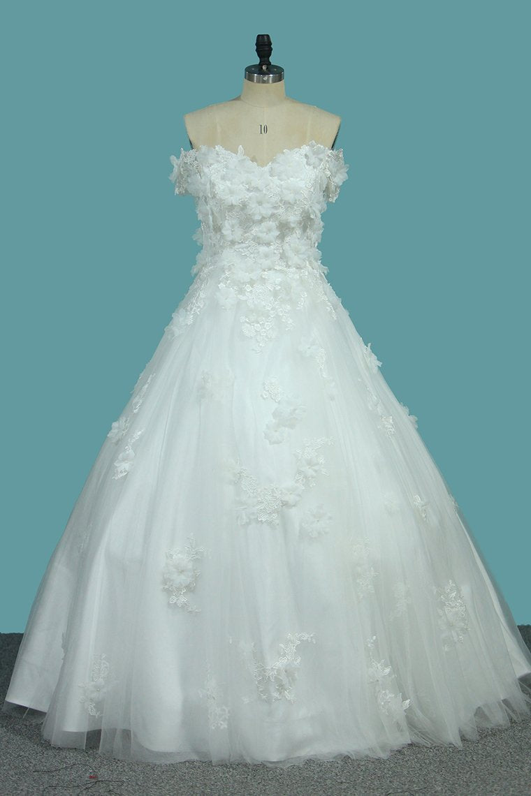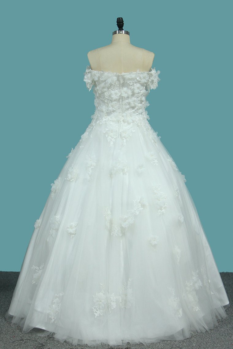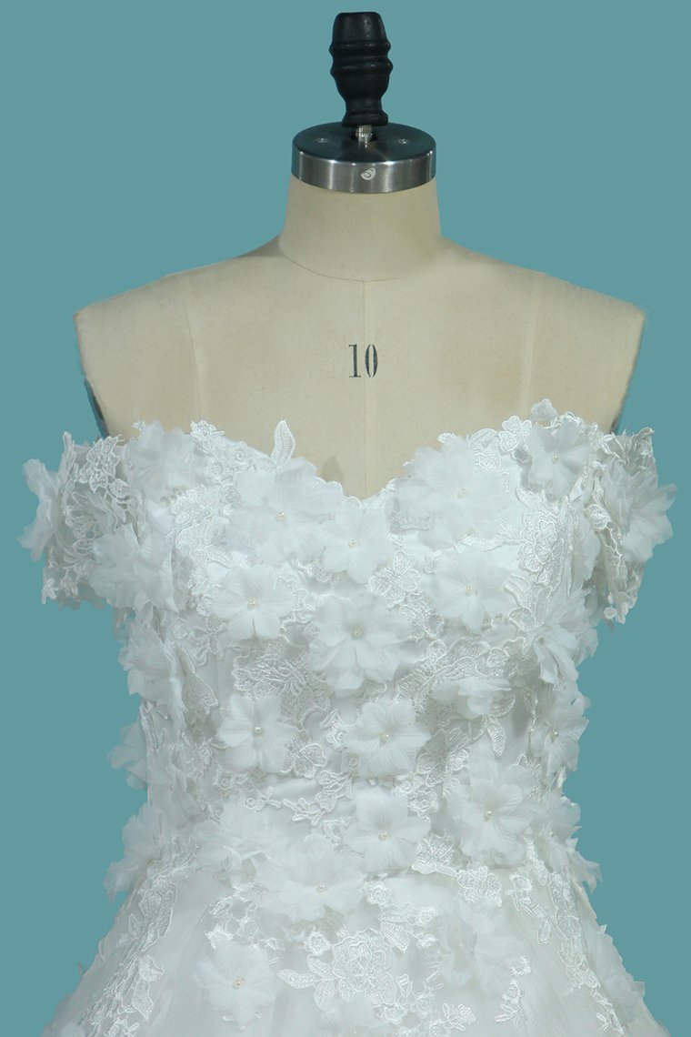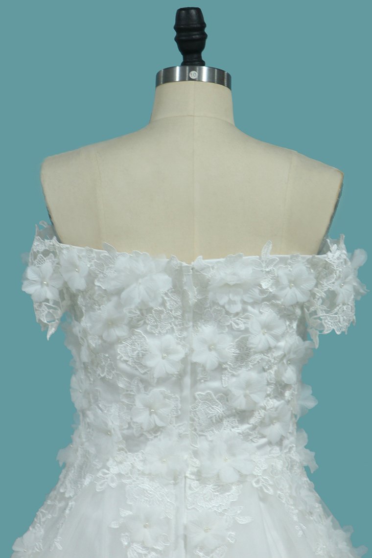 2024 Off The Shoulder Tulle A Line Wedding Dresses With Applique And Handmade Flower