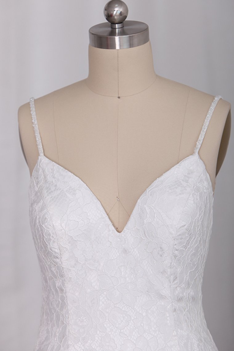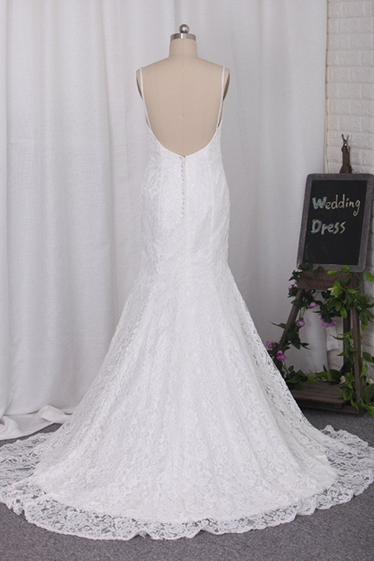 2024 Open Back Lace Spaghetti Straps Sweep Train Wedding Dresses