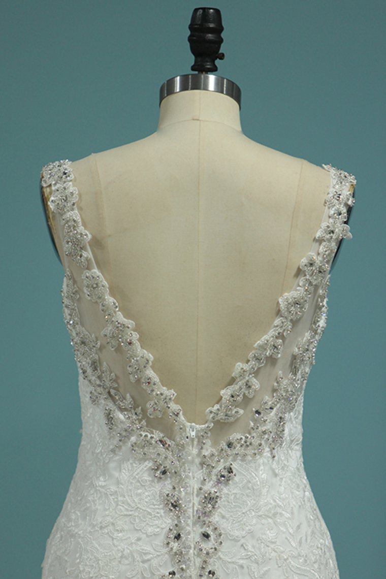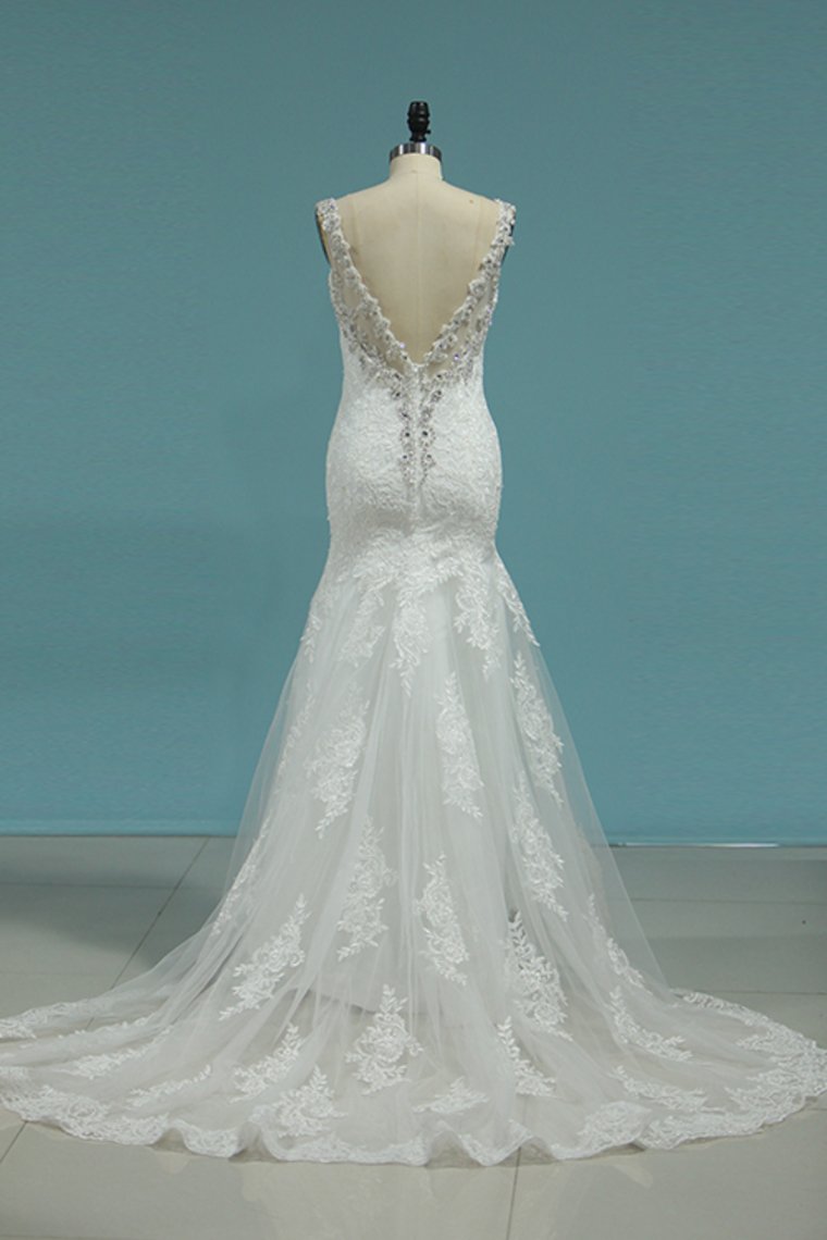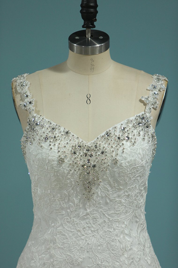 2024 Open Back Mermaid Wedding Dresses Spaghetti Straps Tulle With Applique And Beads
