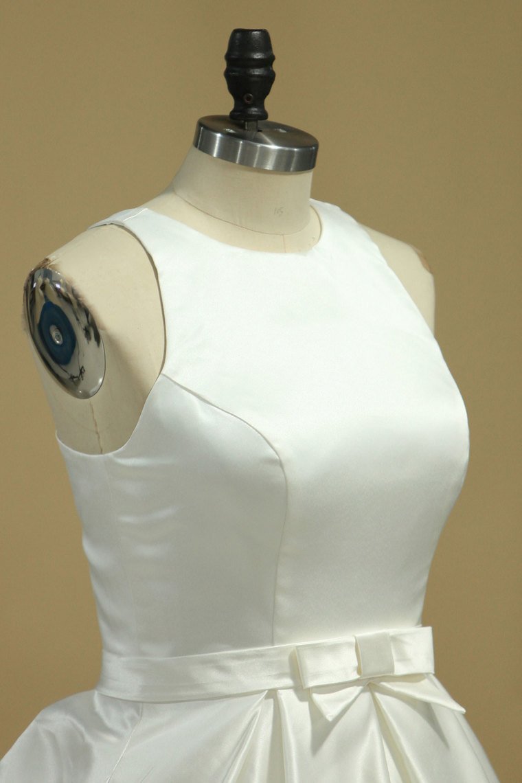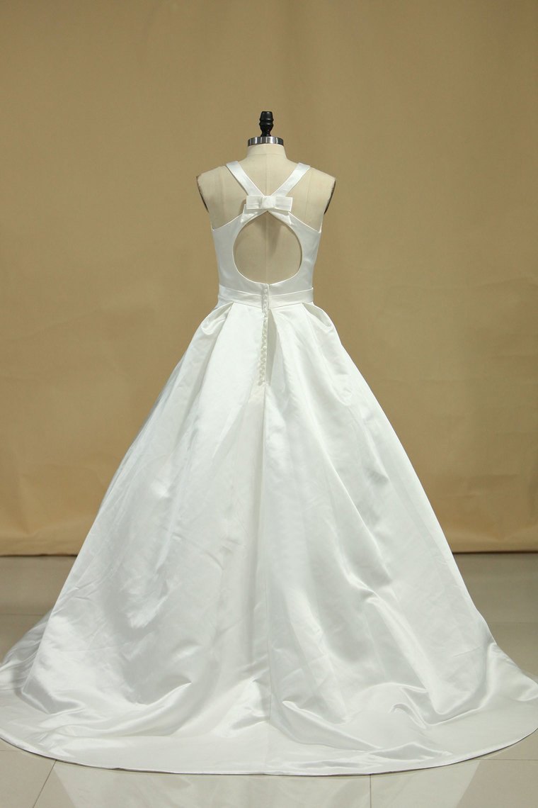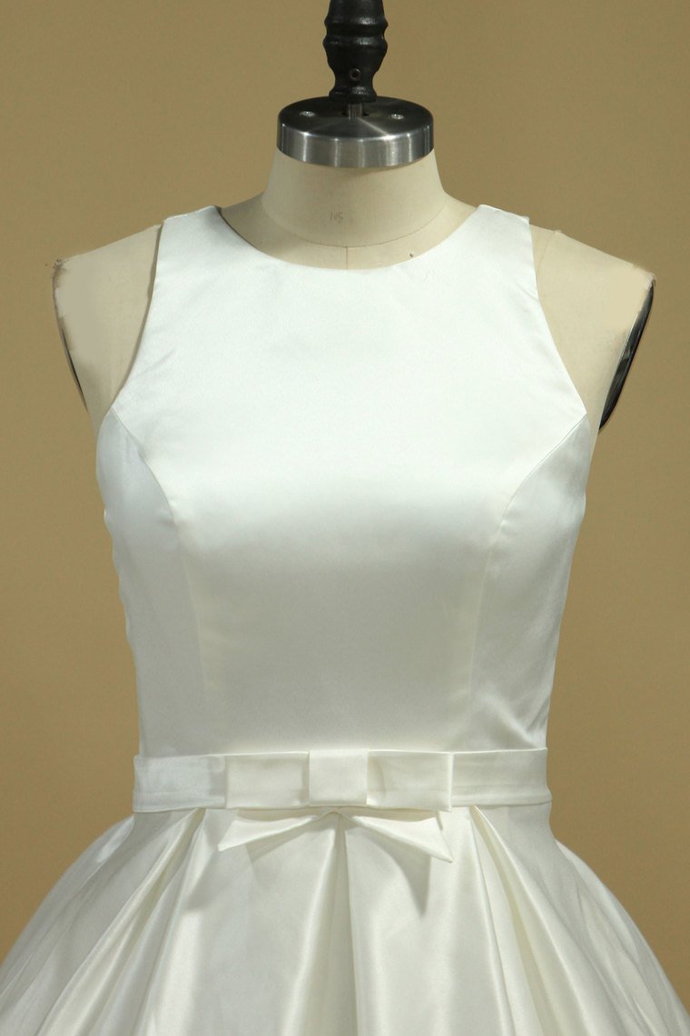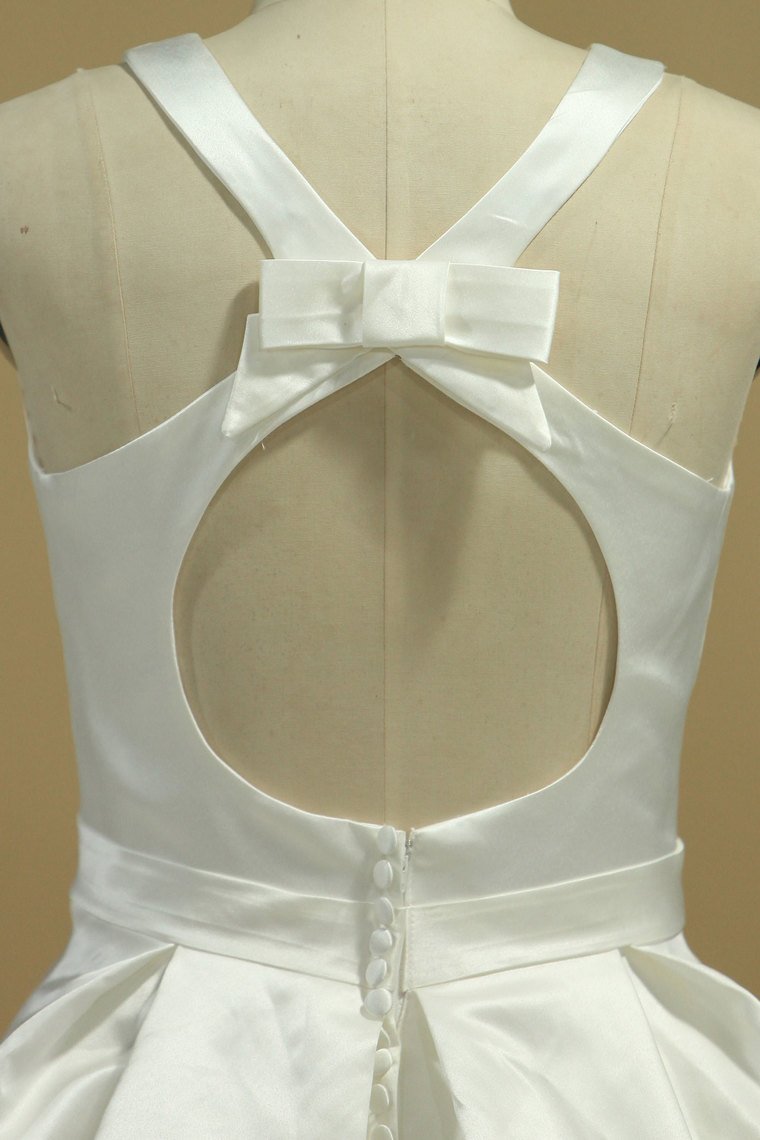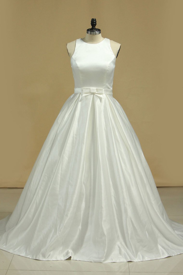 2024 Open Back Scoop A Line Wedding Dresses Satin Sweep Train