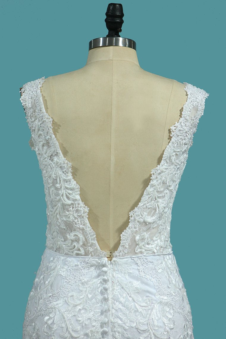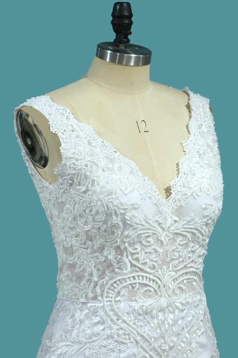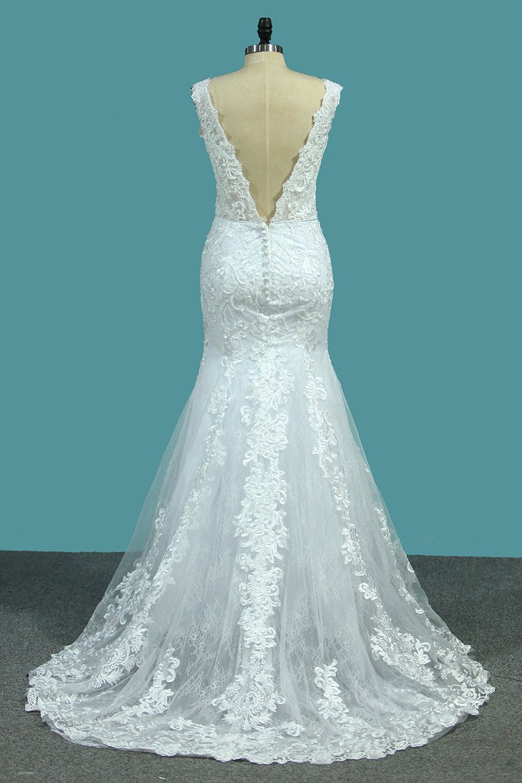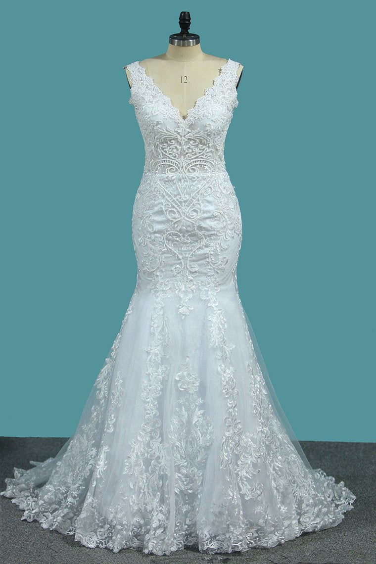 2024 Open Back V Neck Tulle & Lace Wedding Dresses With Applique And Beads