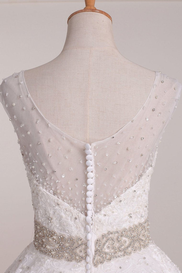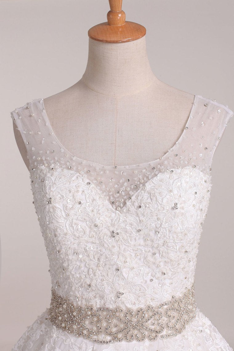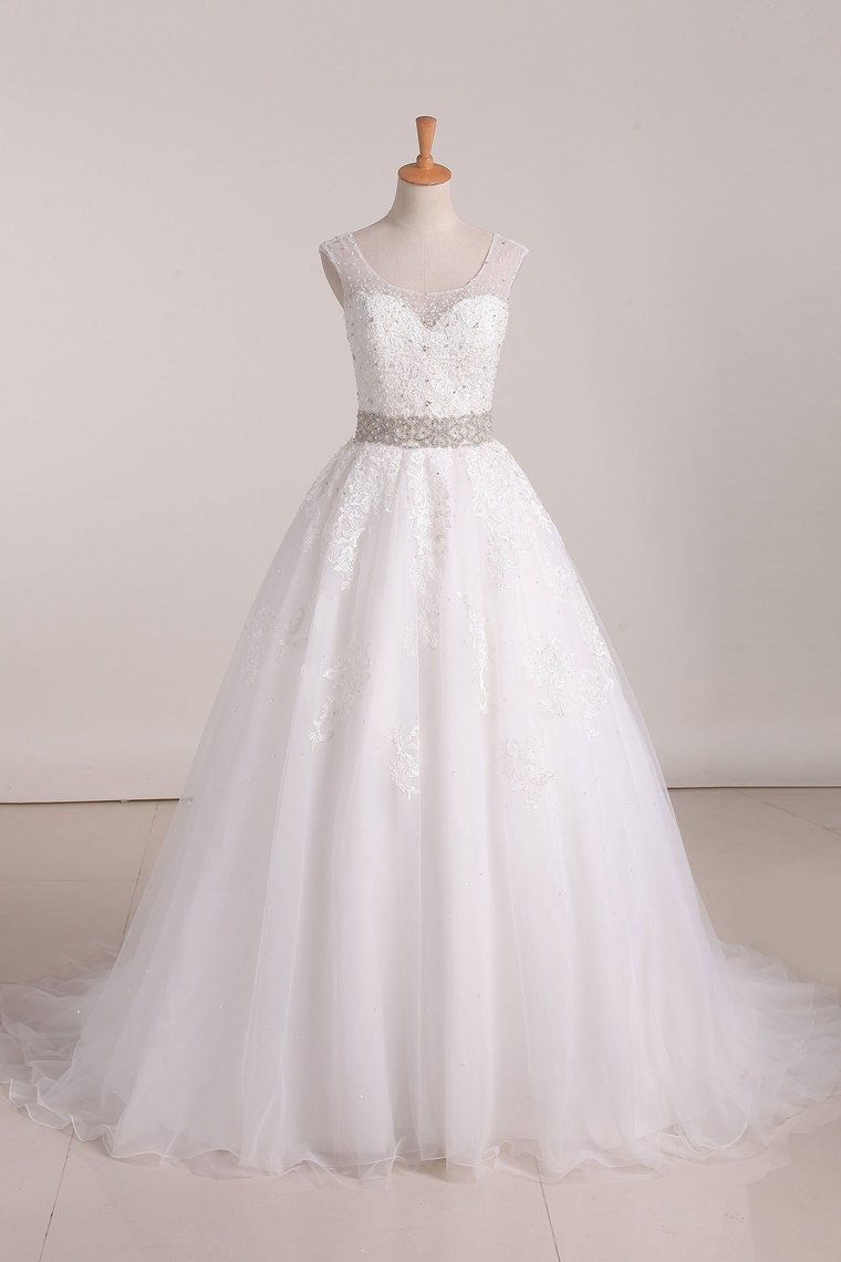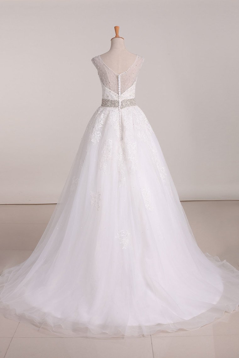 2024 Organza Scoop A Line With Applique And Beads Court Train Wedding Dresses