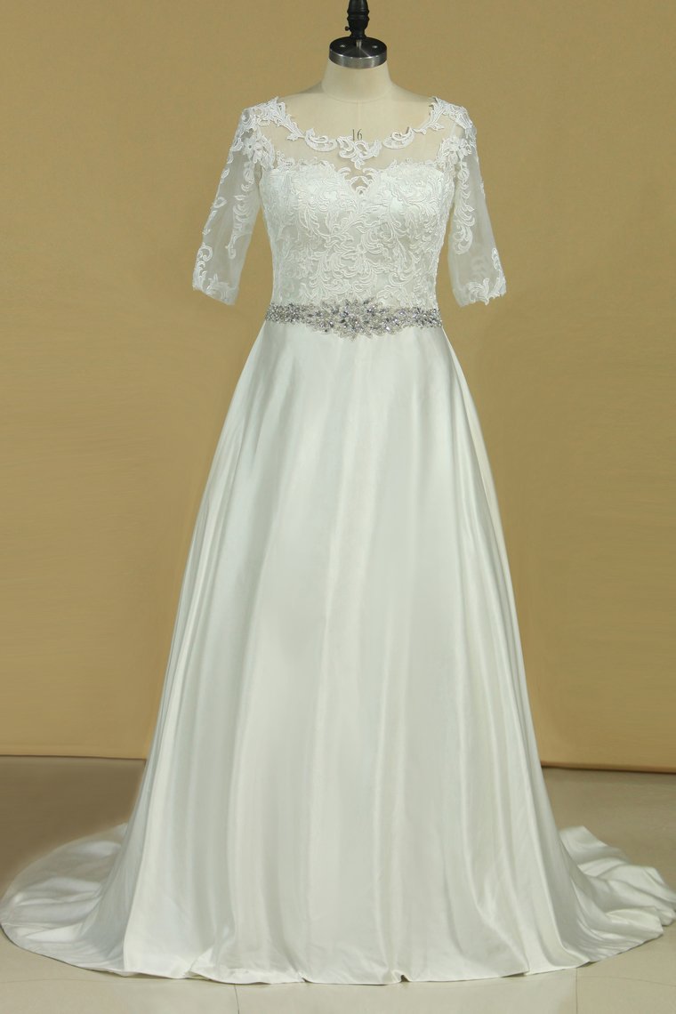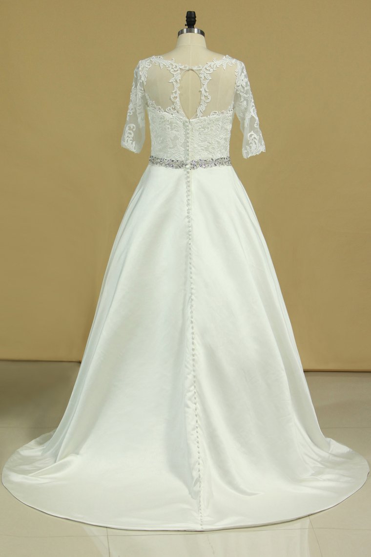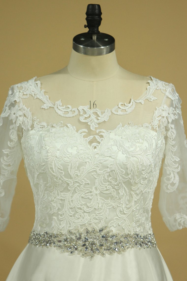 2024 Plus Size Mid-Length Sleeve Wedding Dresses Scoop Satin With Applique