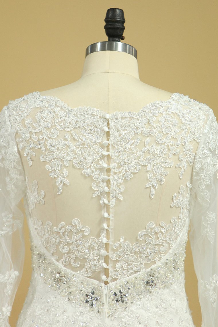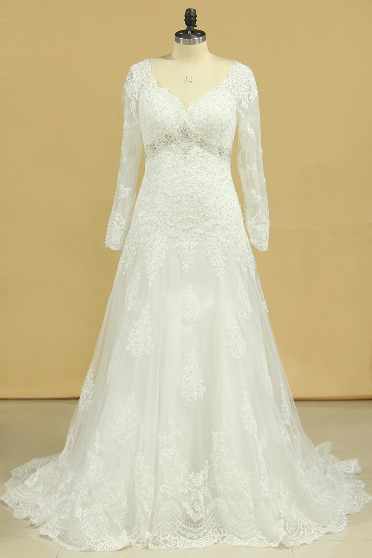 2024 Plus Size V-Neck Long Sleeves Wedding Dresses With Applique Tulle