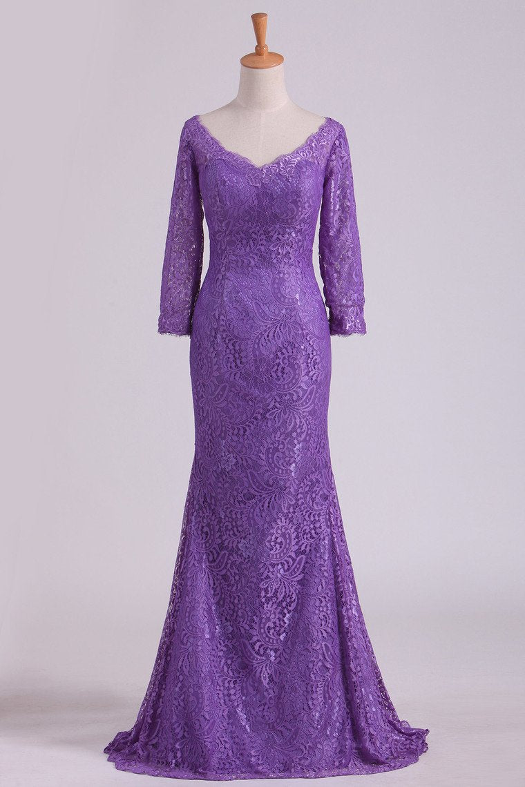 2024 Purple Mother Of The Bride Dresses V Neck 3/4 Length Sleeve Mermaid Lace Floor Length