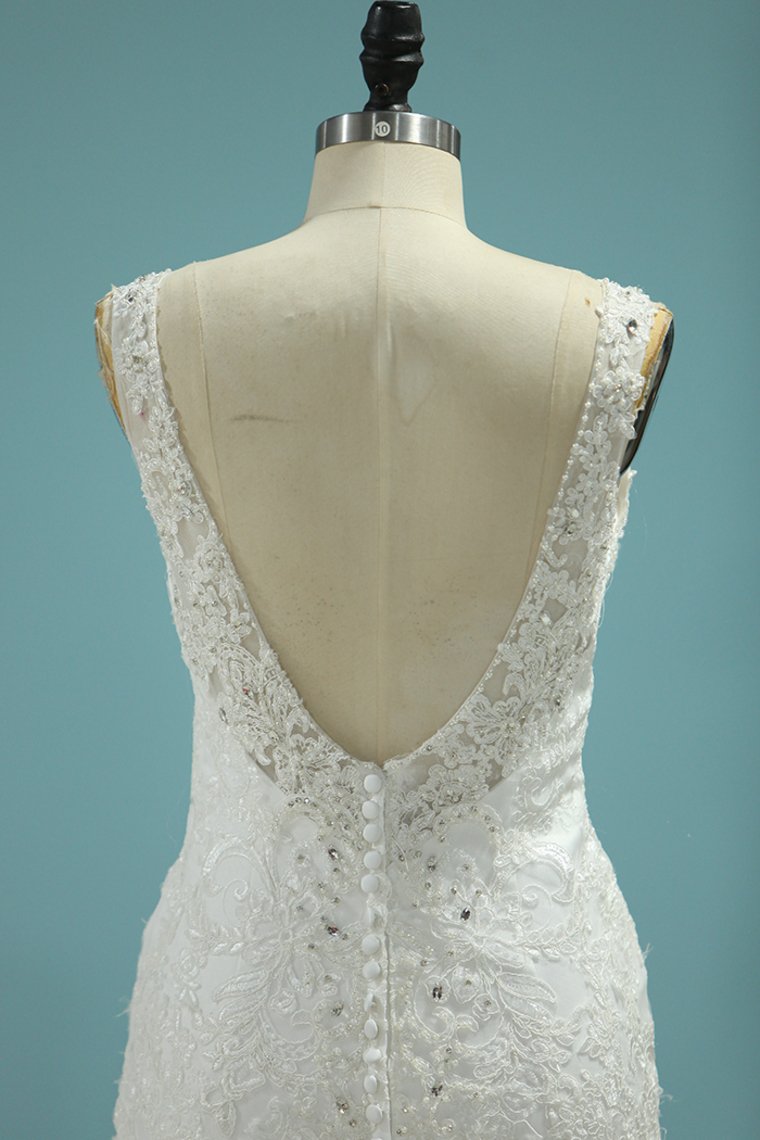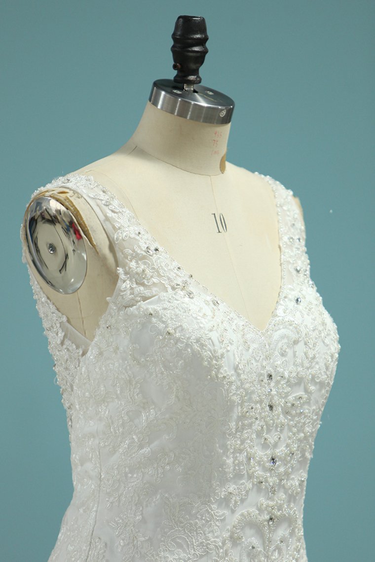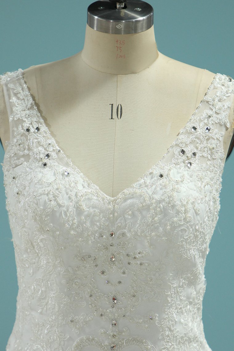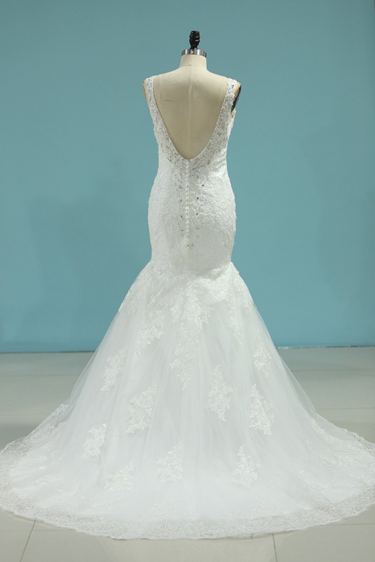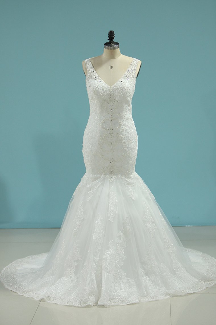 2024 Romantic Wedding Dresses 2024 Mermaid/Trumpet V-Neck Court Train Beaded Tulle Open Back With Zipper