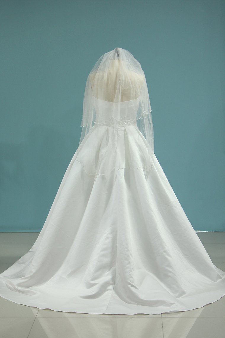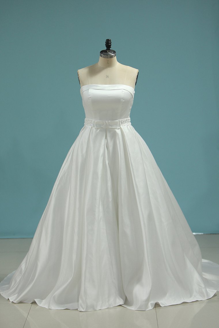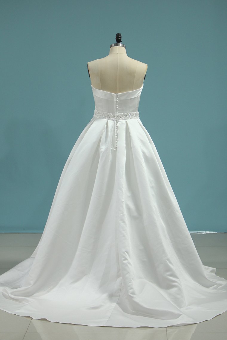2024 Satin Strapless Beaded Waistline Wedding Dresses A Line Covered Button