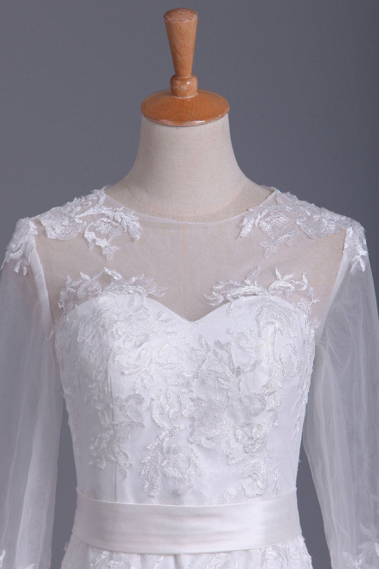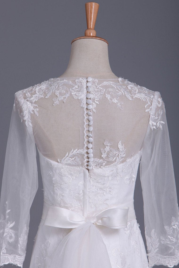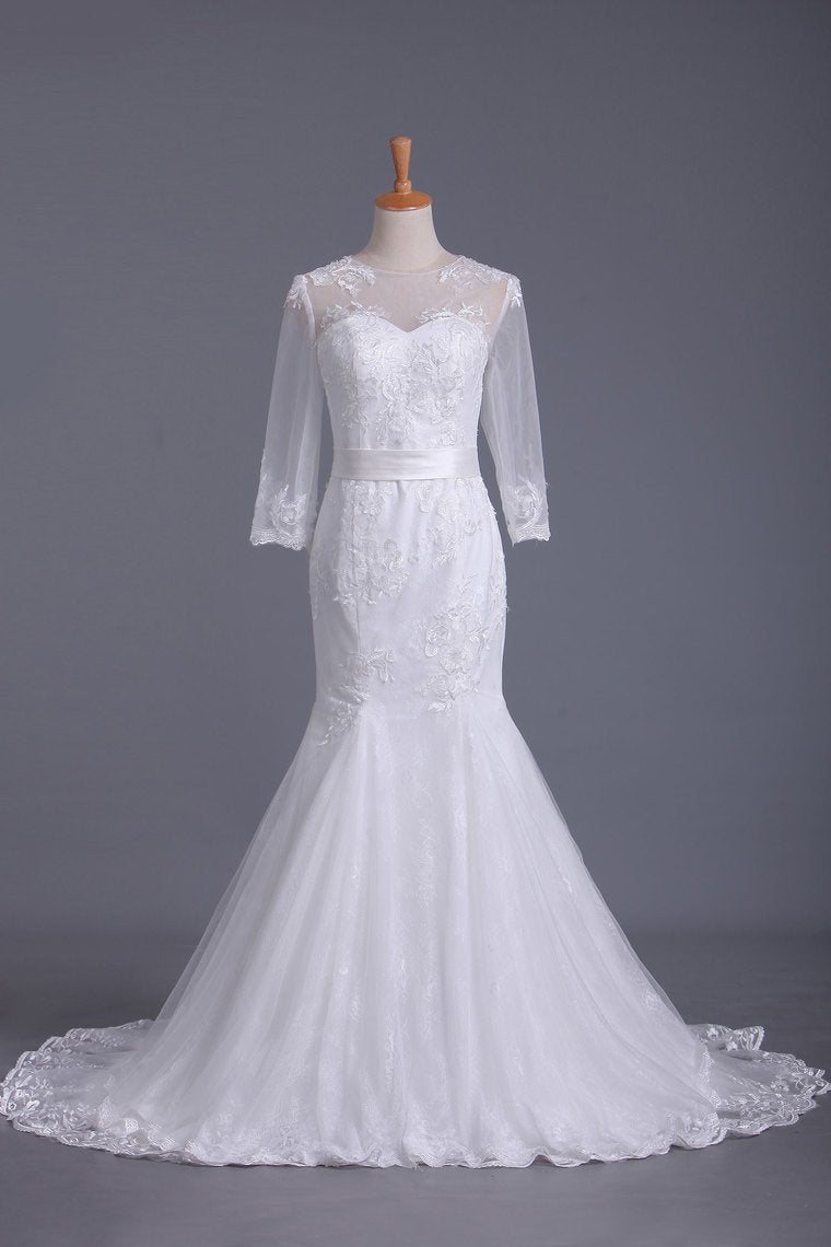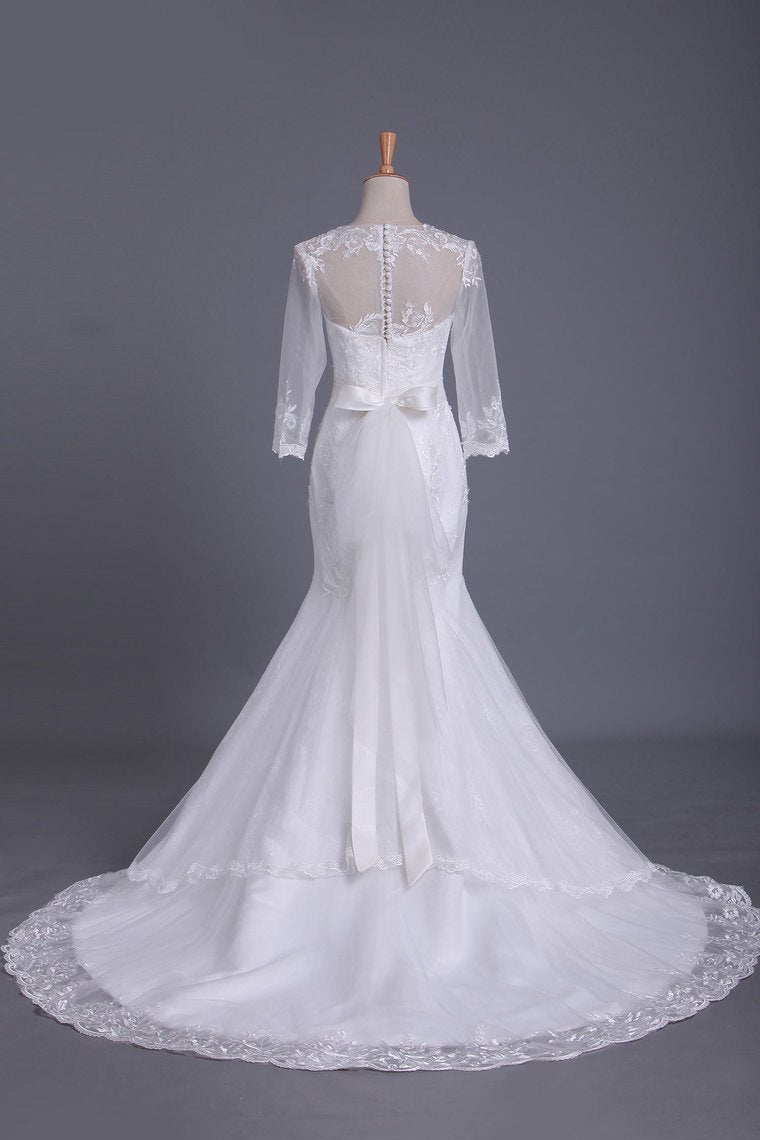 2024 Scoop 3/4 Length Sleeve Mermaid Wedding Dress Tulle With Sash Court Train