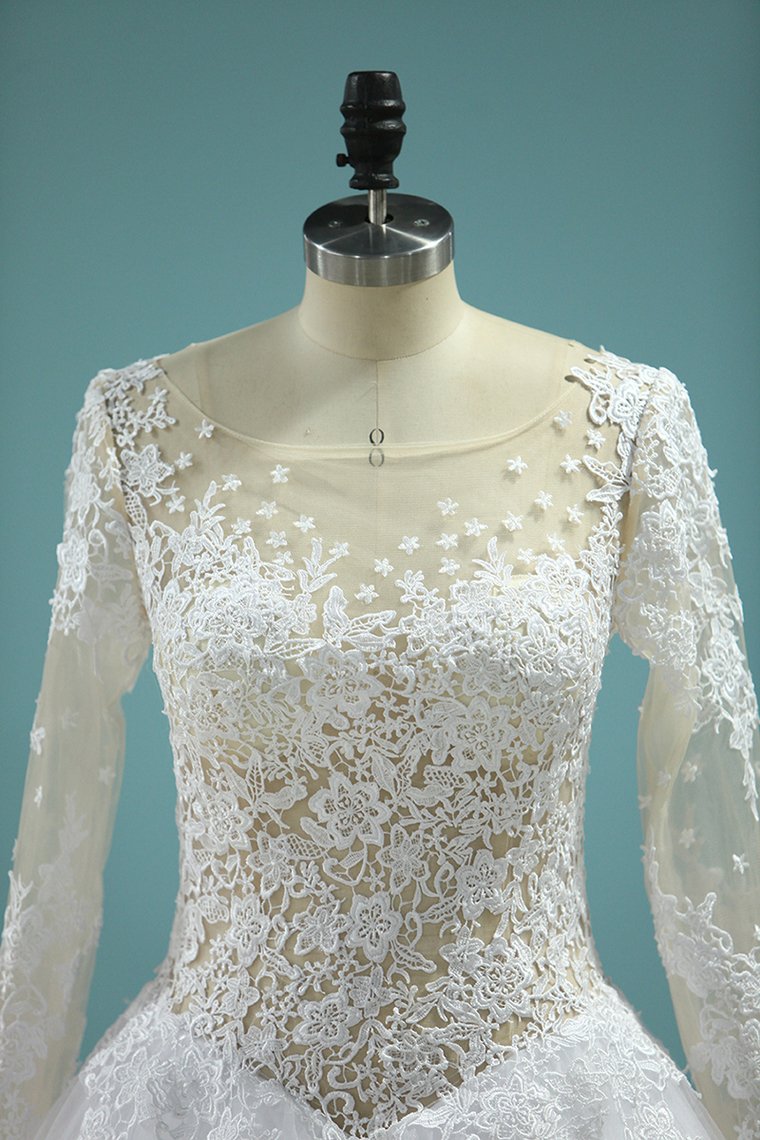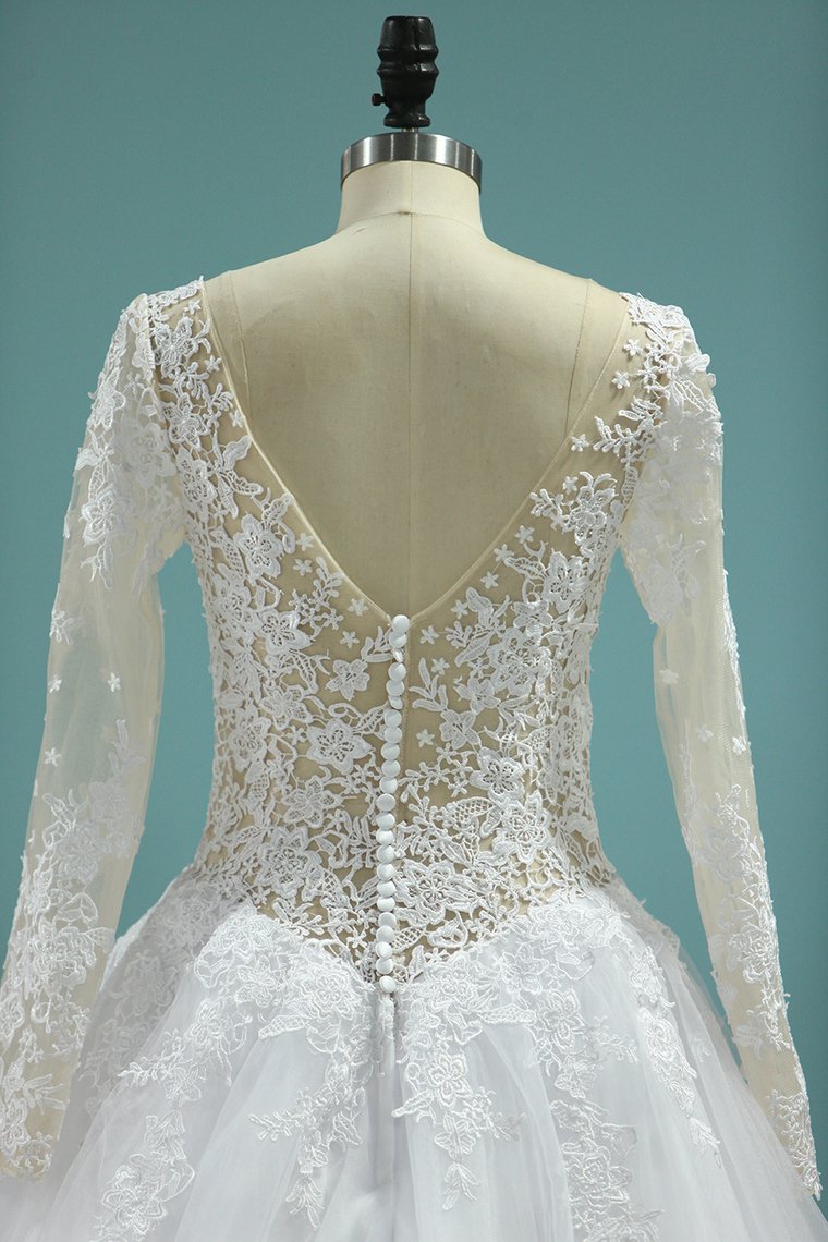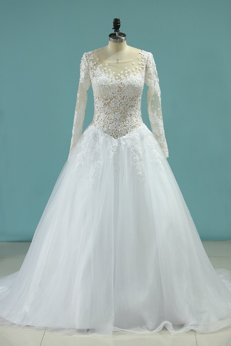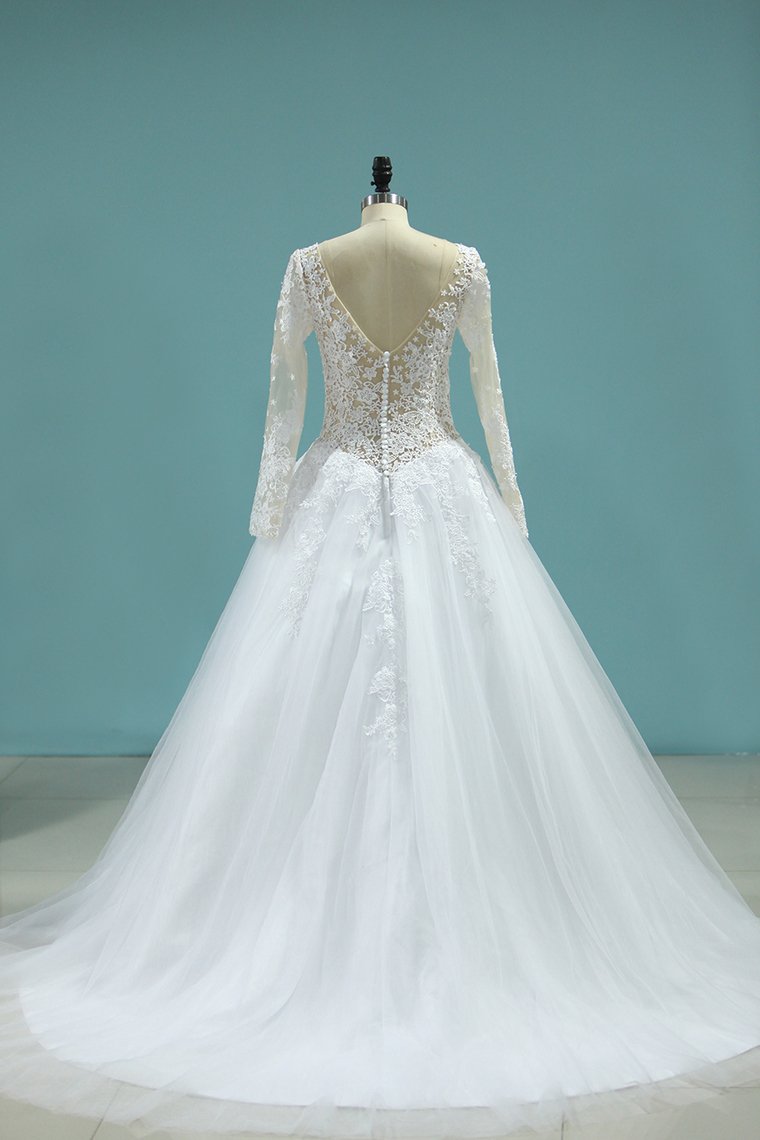 2024 Scoop A-Line Wedding Dresses Court Train Tulle With Applique Long Sleeves