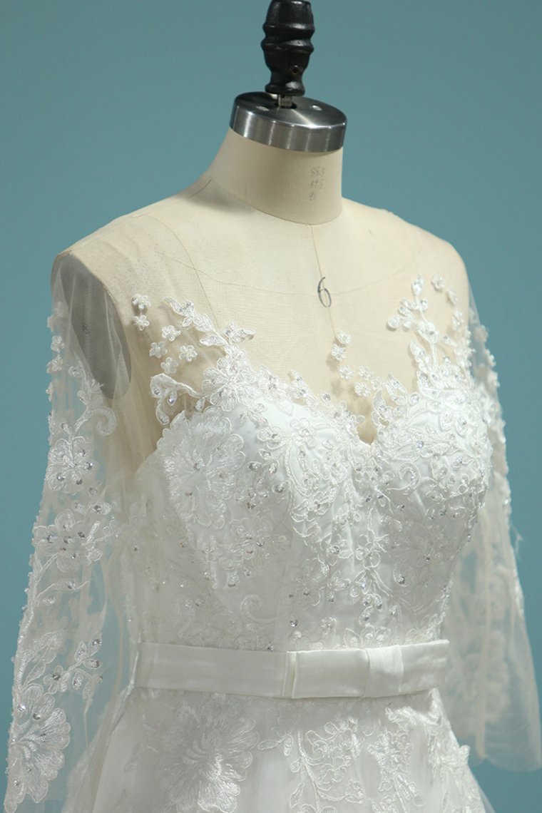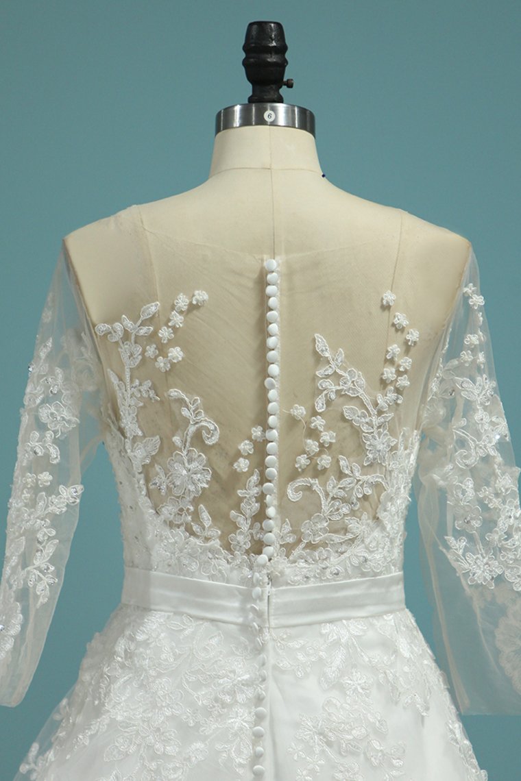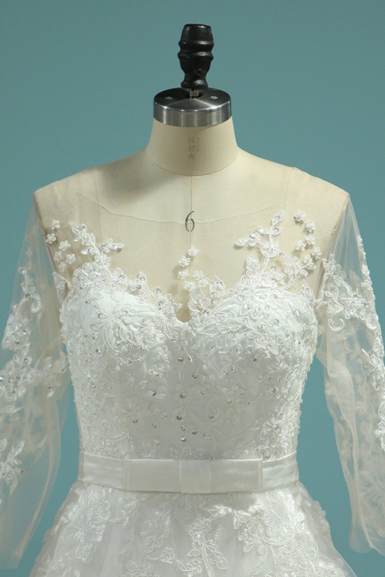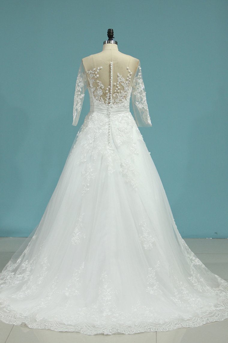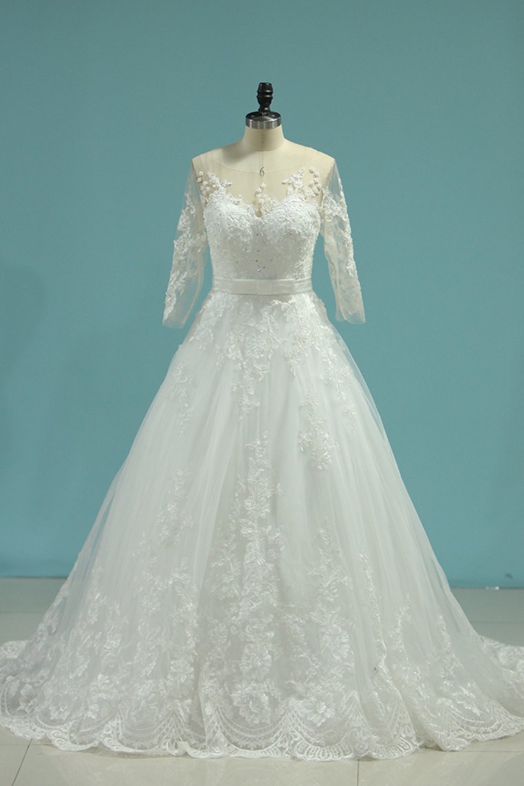 2024 Scoop A Line Wedding Dresses Tulle With Applique And Sash