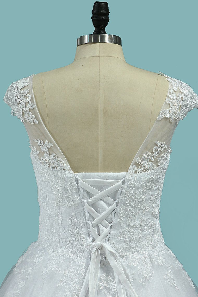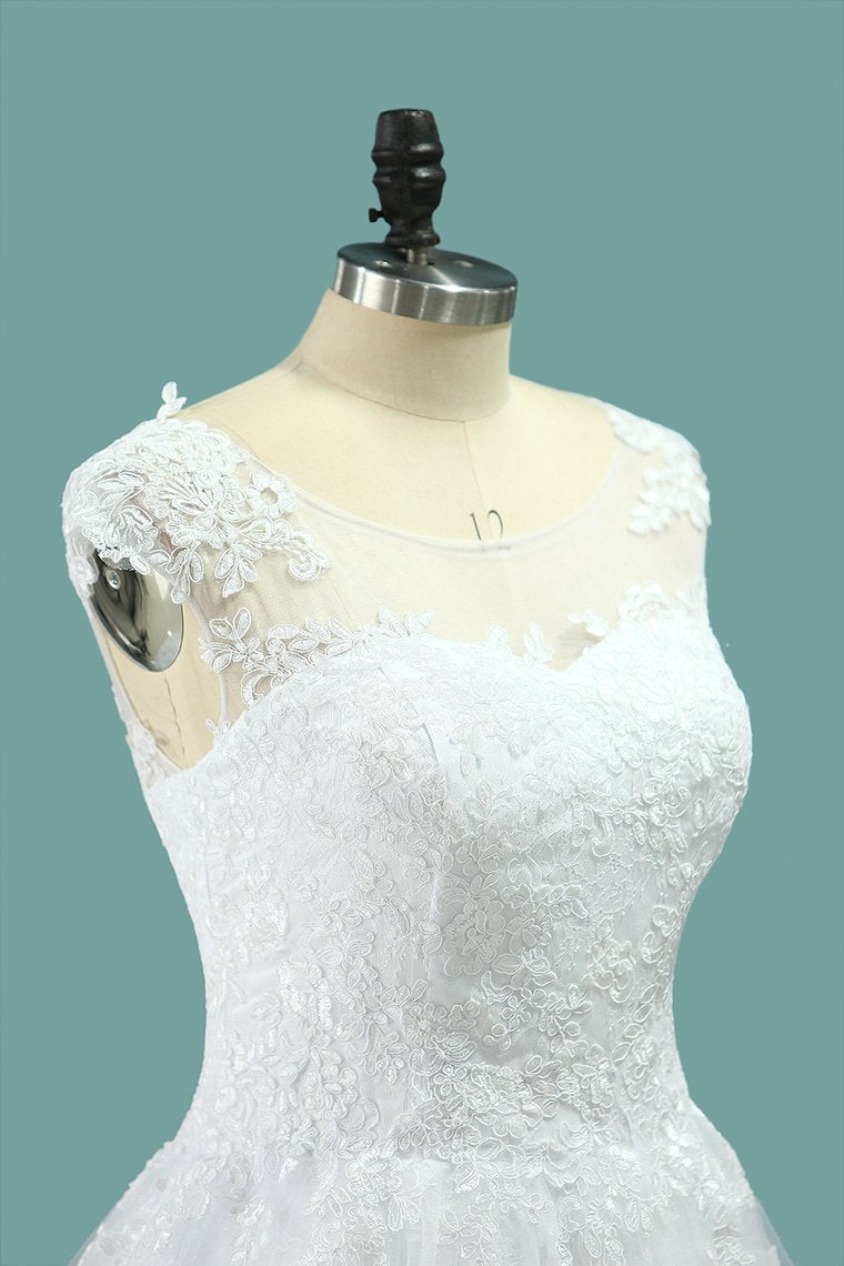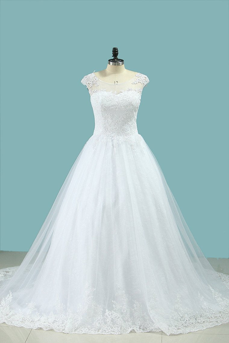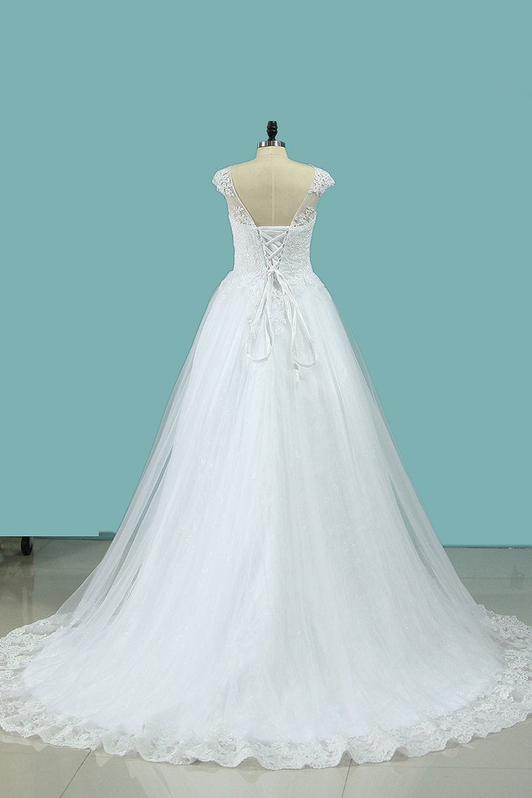 2024 Scoop A Line Wedding Dresses Tulle With Applique Cathedral Train