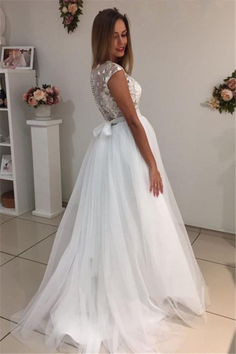 2024 Scoop A Line Wedding Dresses Tulle With Applique Sweep Train