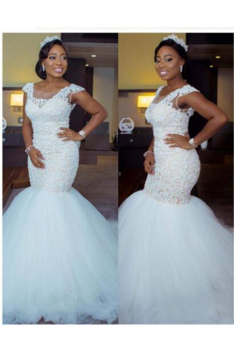 2024 Scoop Cap Sleeve Mermaid Wedding Dresses Tulle With Applique Court Train