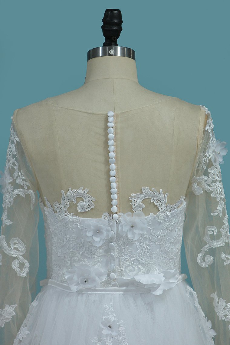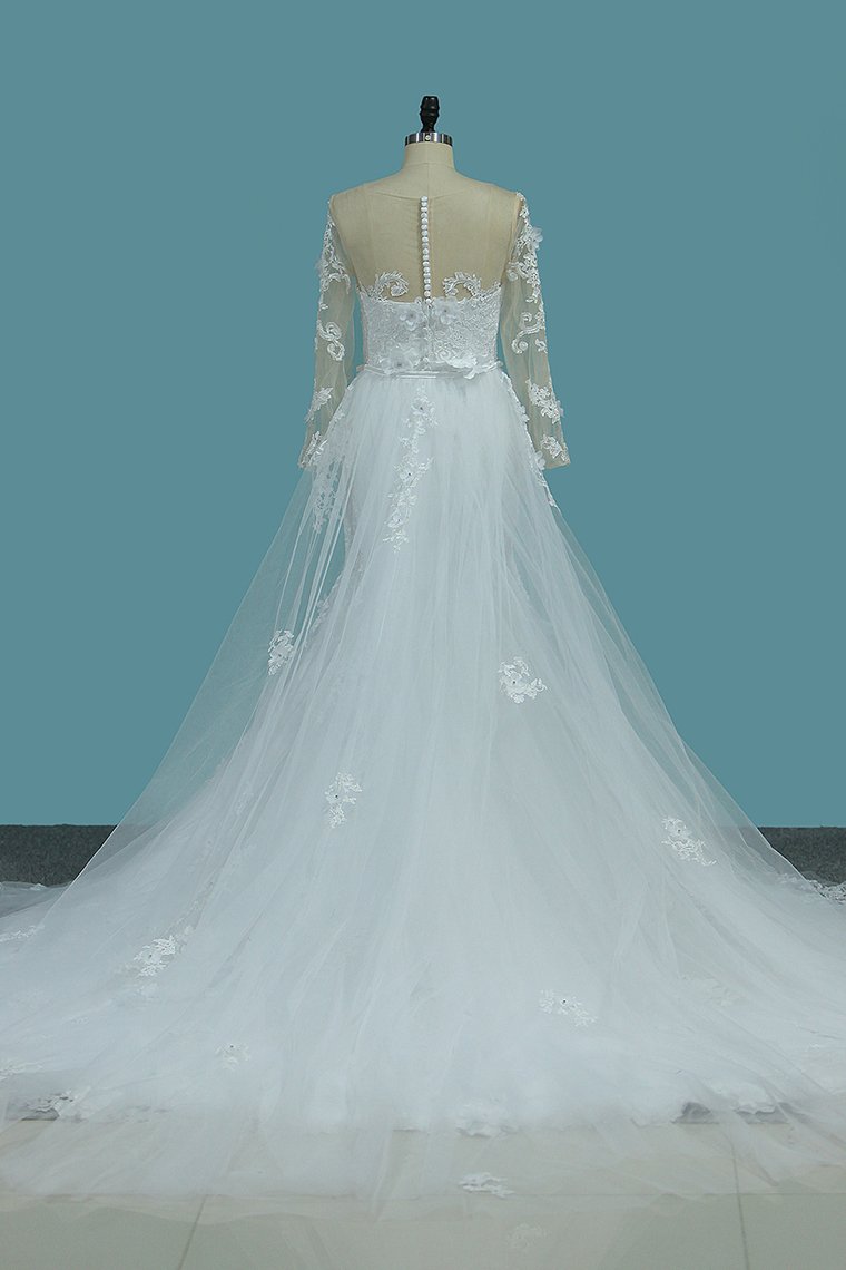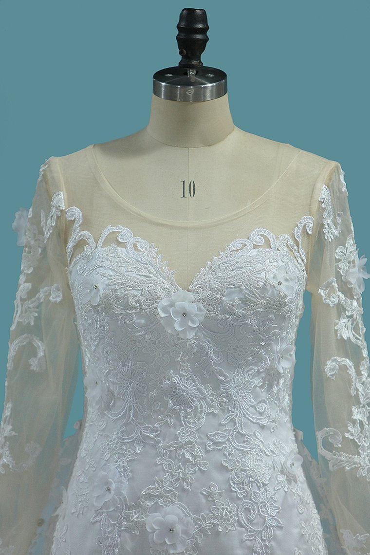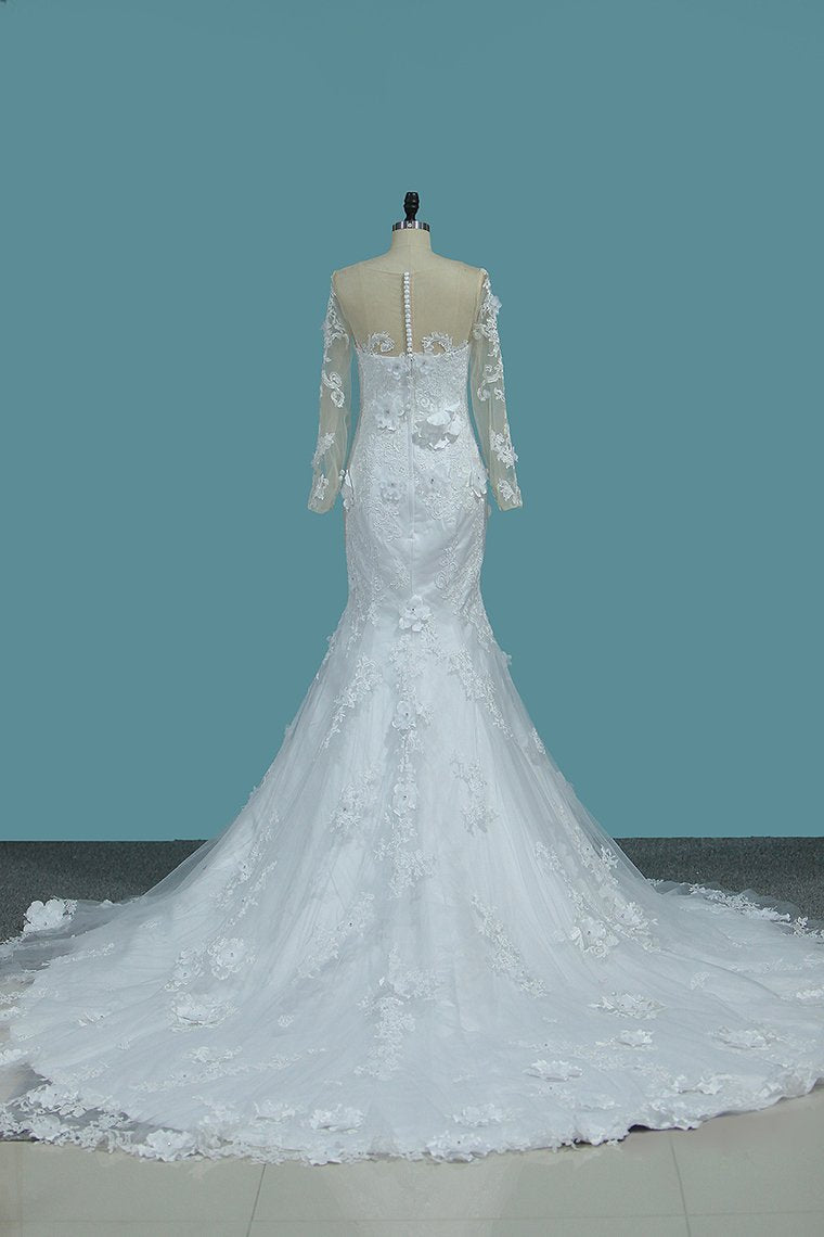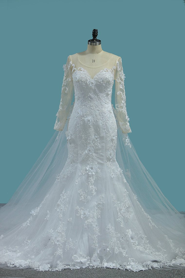2024 Scoop Long Sleeves Mermaid Wedding Dresses With Applique Tulle Chapel Train Detachable