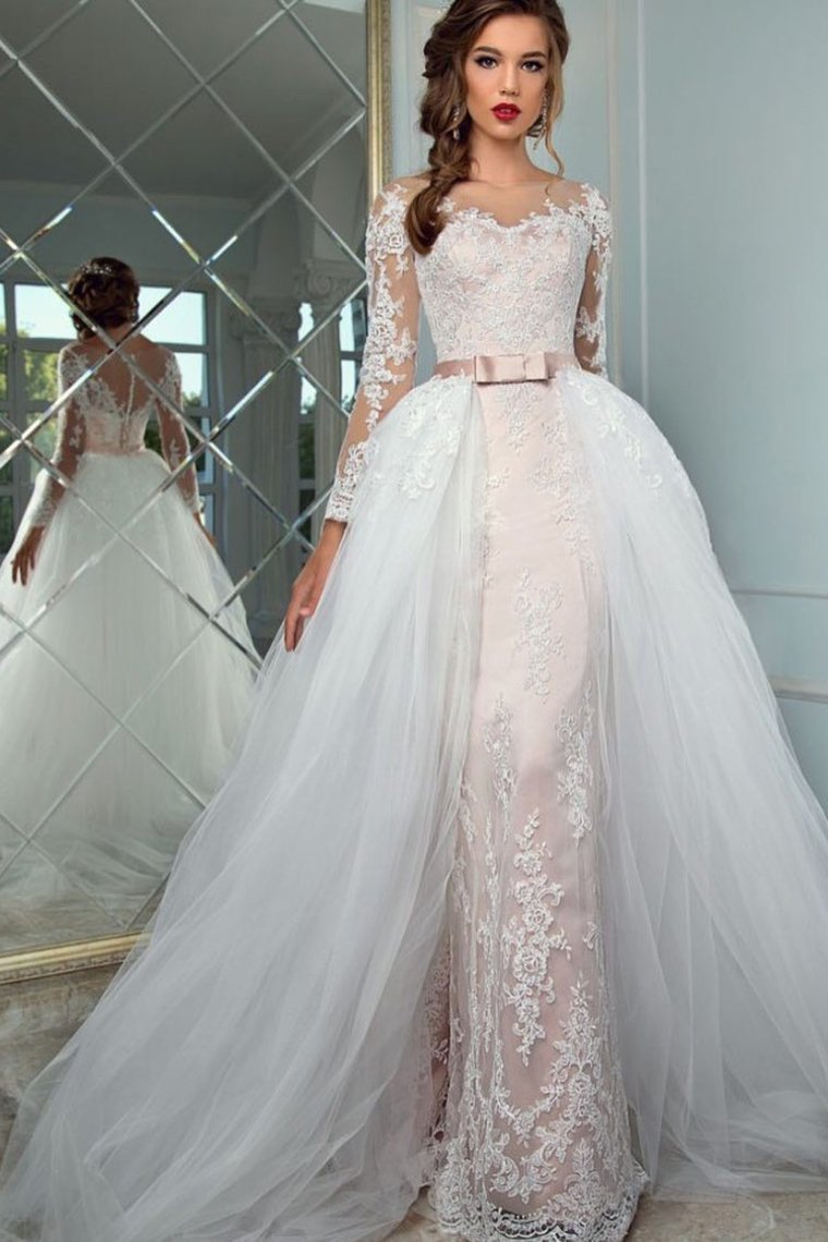 2024 Scoop Long Sleeves Sheath Wedding Dresses Tulle With Applique Chapel Train Detachable