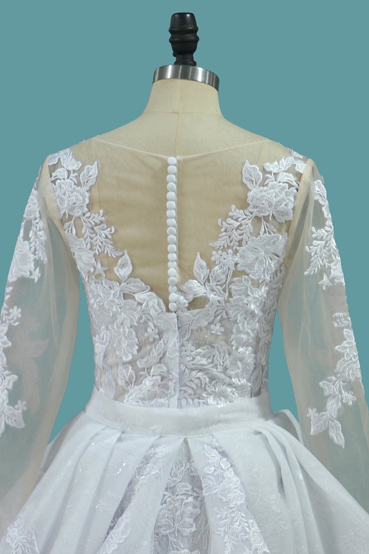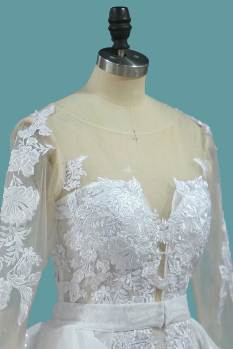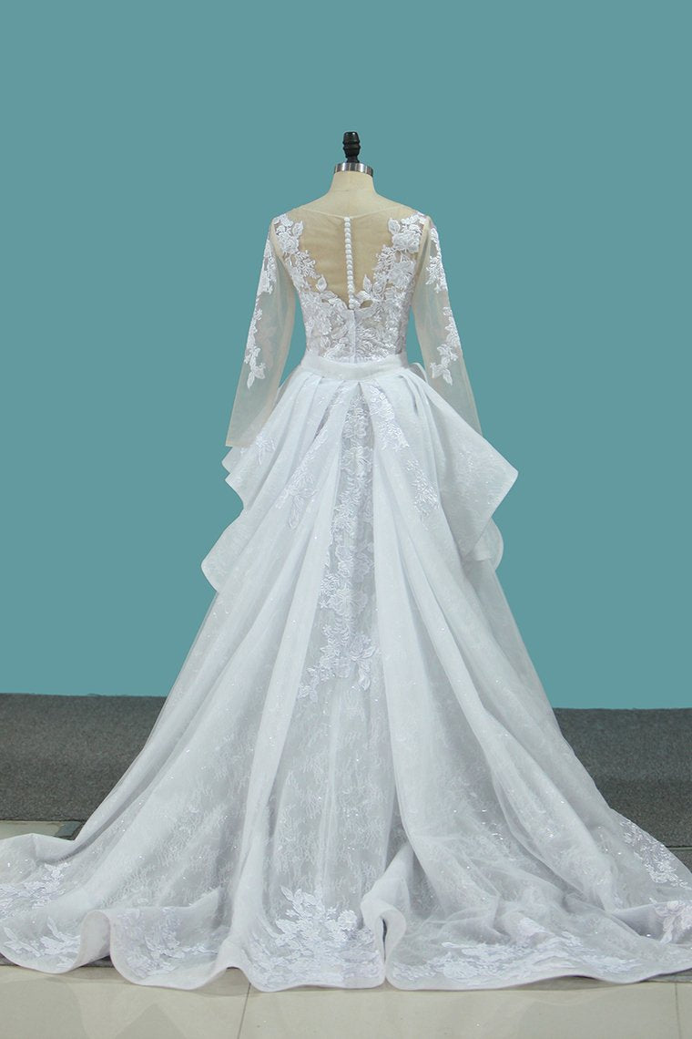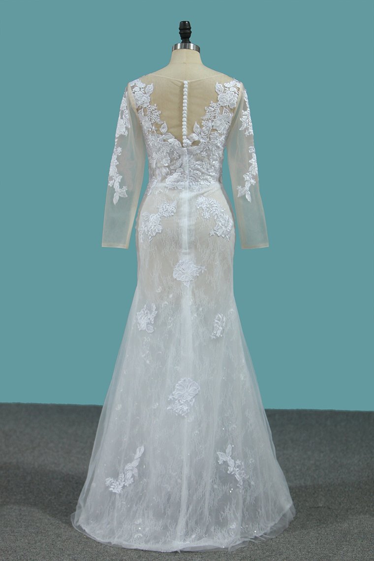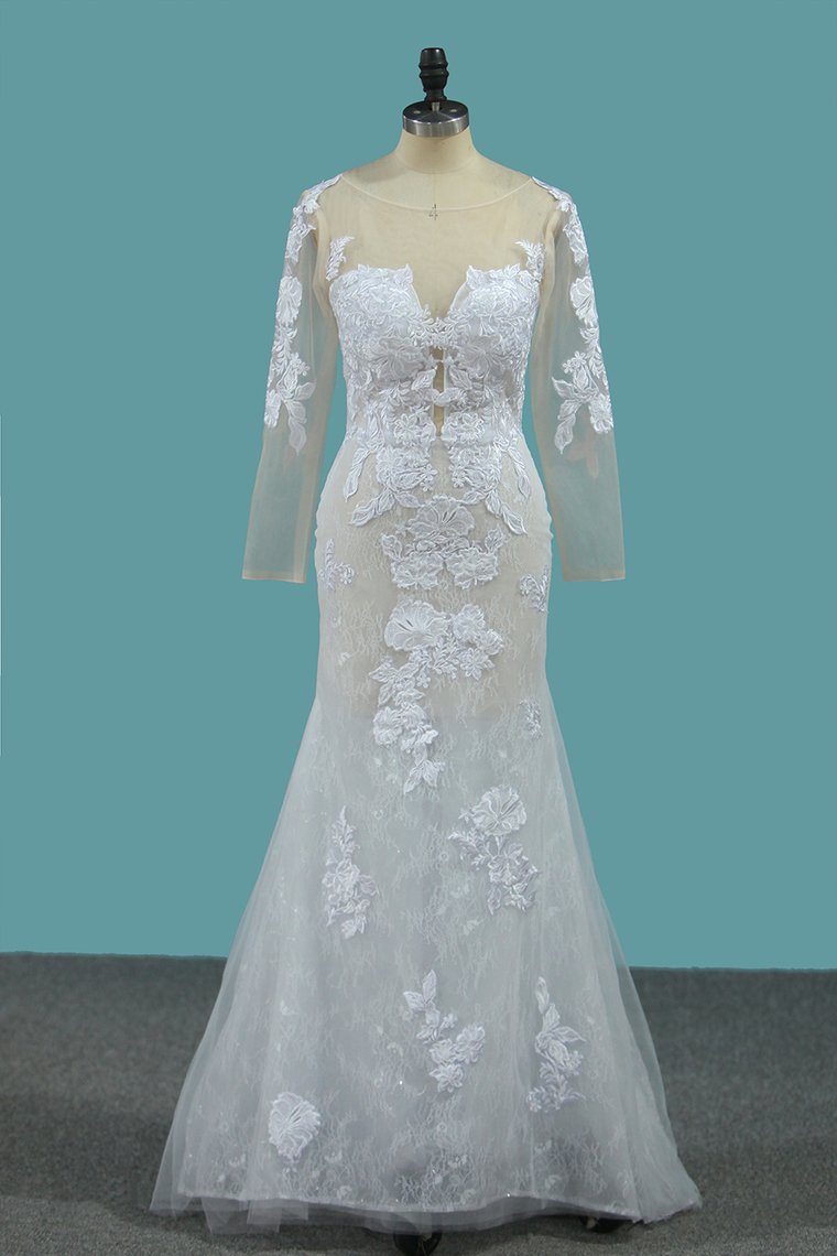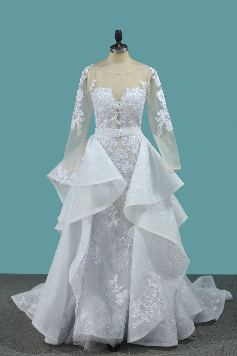 2024 Scoop Long Sleeves Tulle & Lace Mermaid With Applique Chapel Train Detachable Wedding Dresses