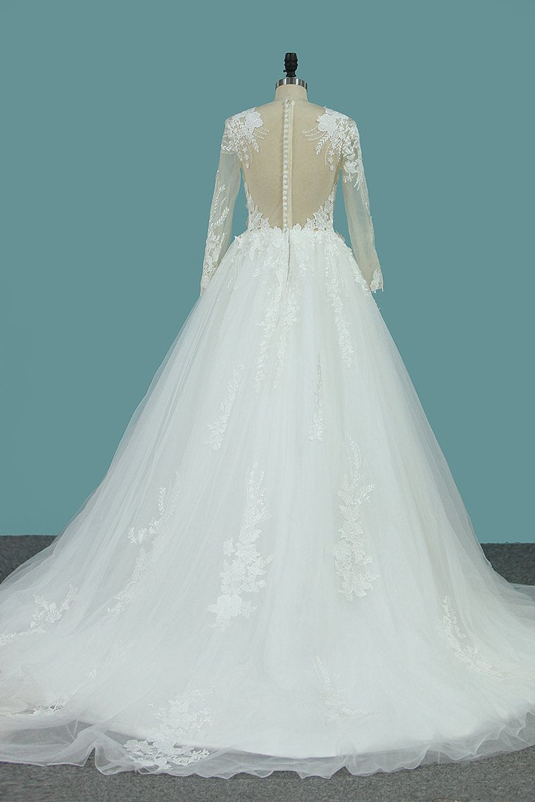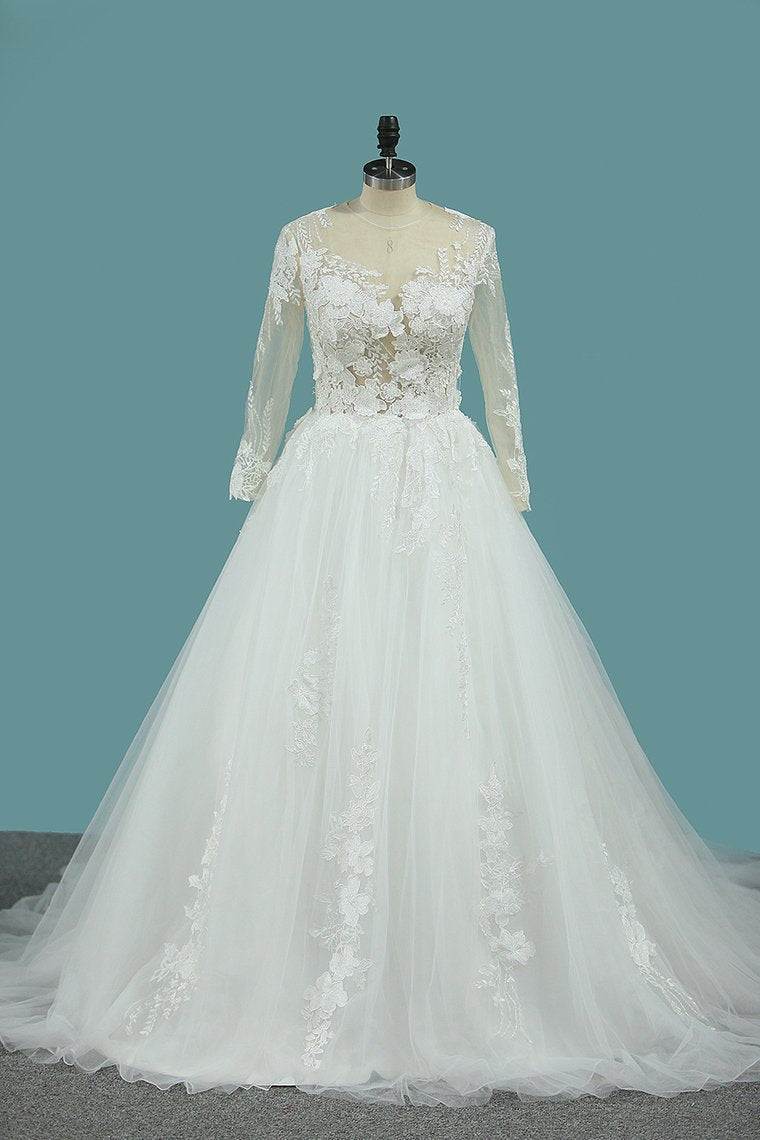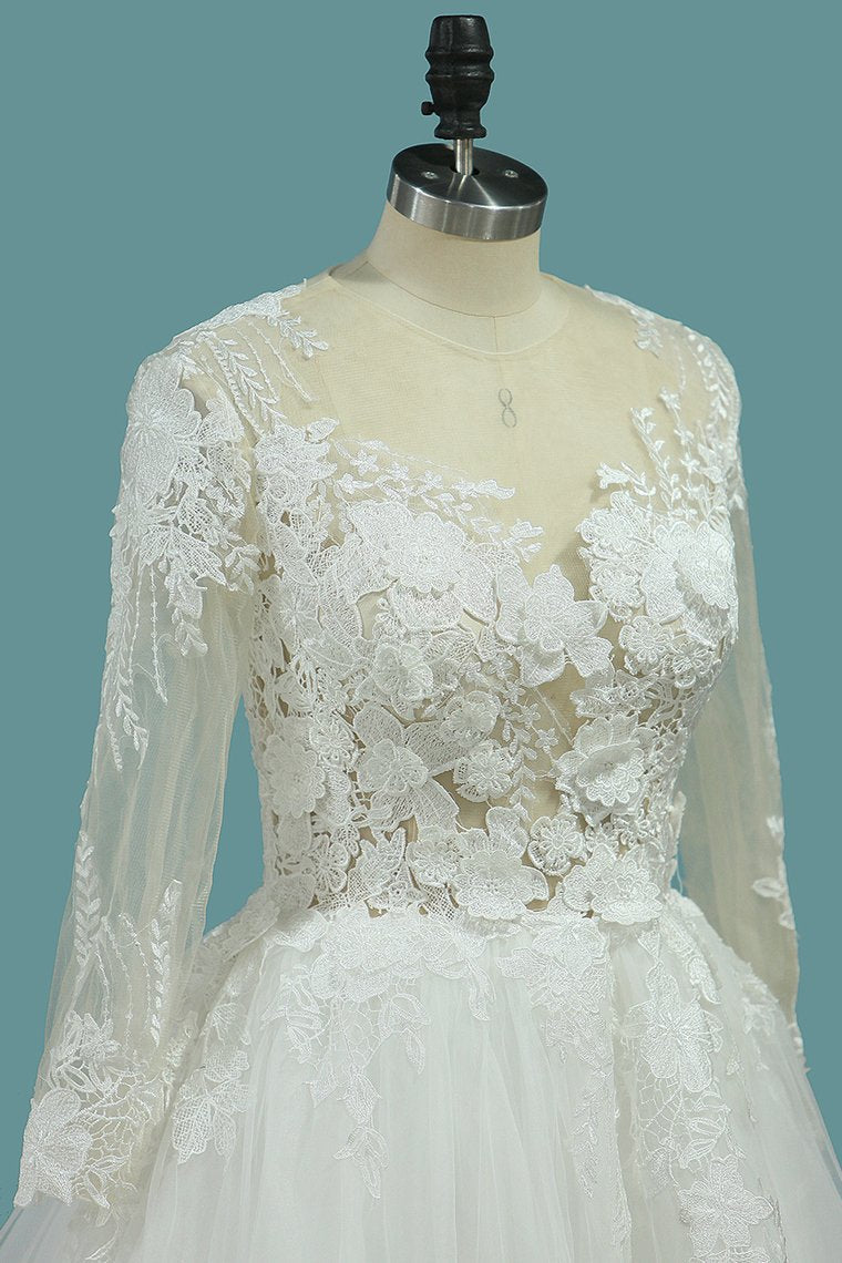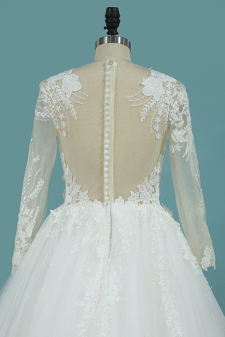 2024 Scoop Long Sleeves Tulle Wedding Dresses With Applique Chapel Train