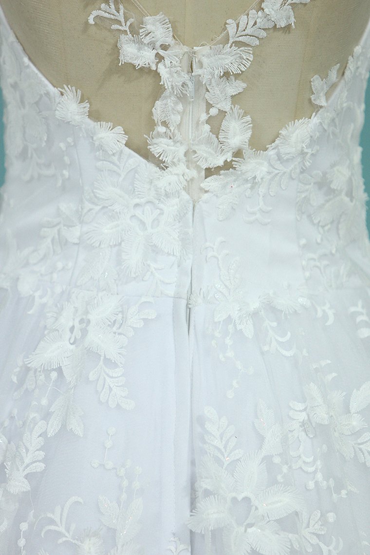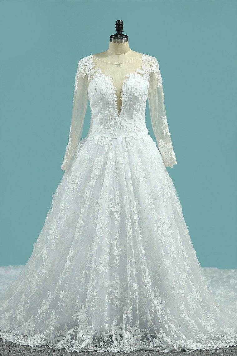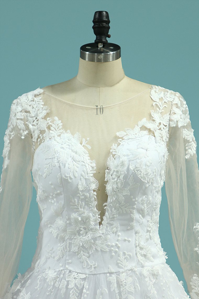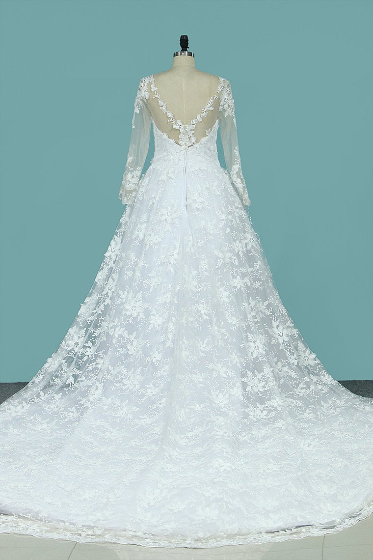 2024 Scoop Long Sleeves Wedding Dresses A Line Tulle With Lace Court Train