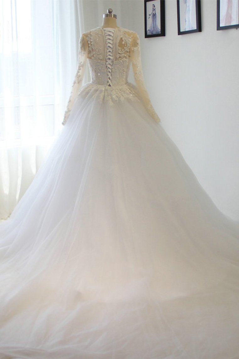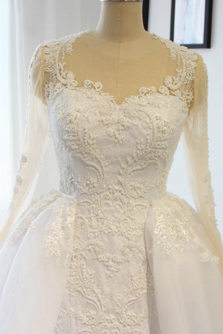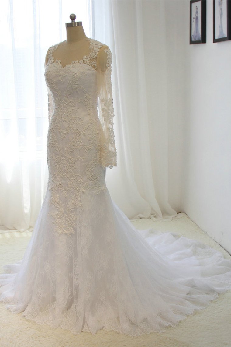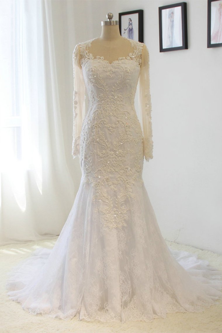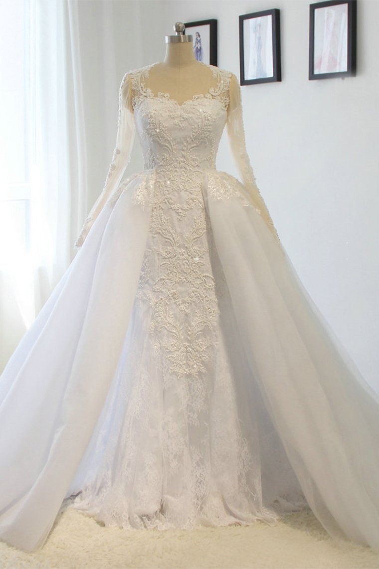 2024 Scoop Long Sleeves Wedding Dresses Mermaid Tulle With Beading Court Train Detachable