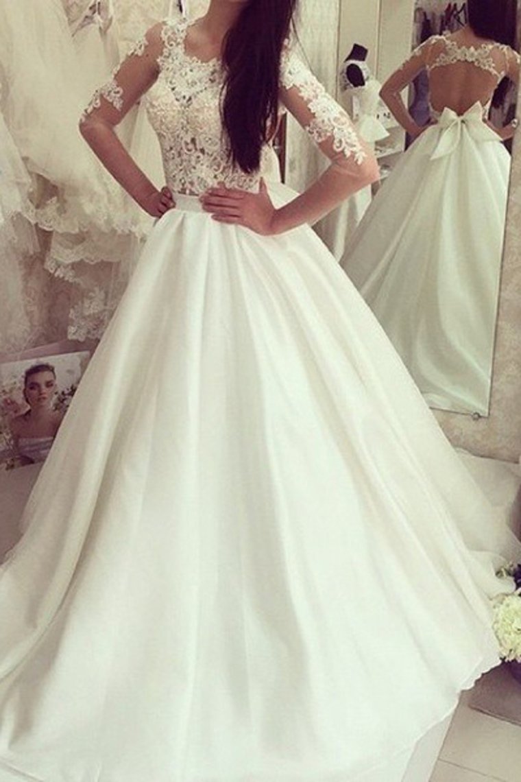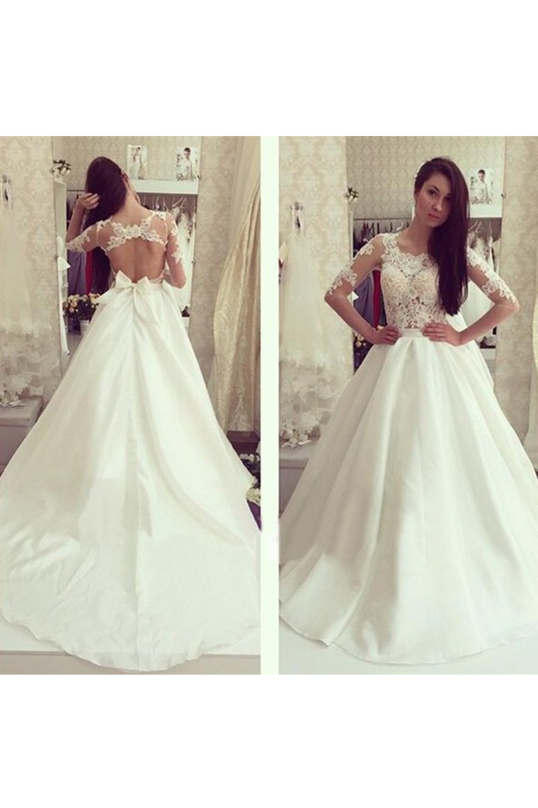 2024 Scoop Mid-Length Sleeves Satin With Applique A Line Wedding Dresses