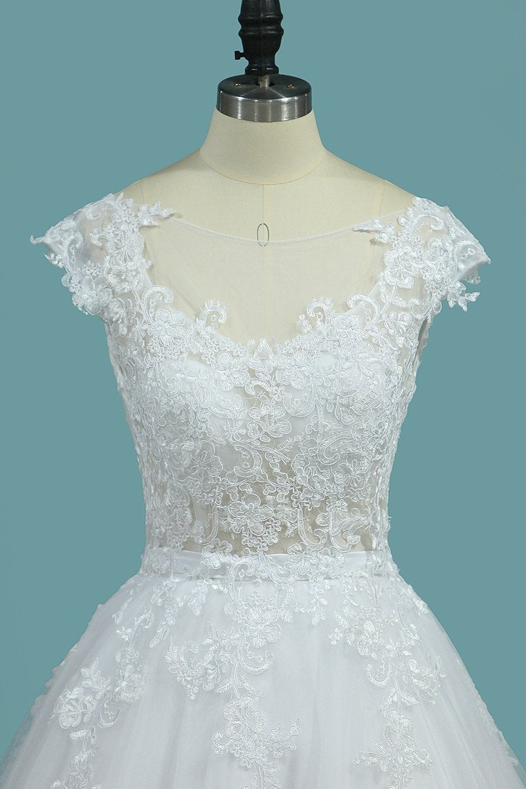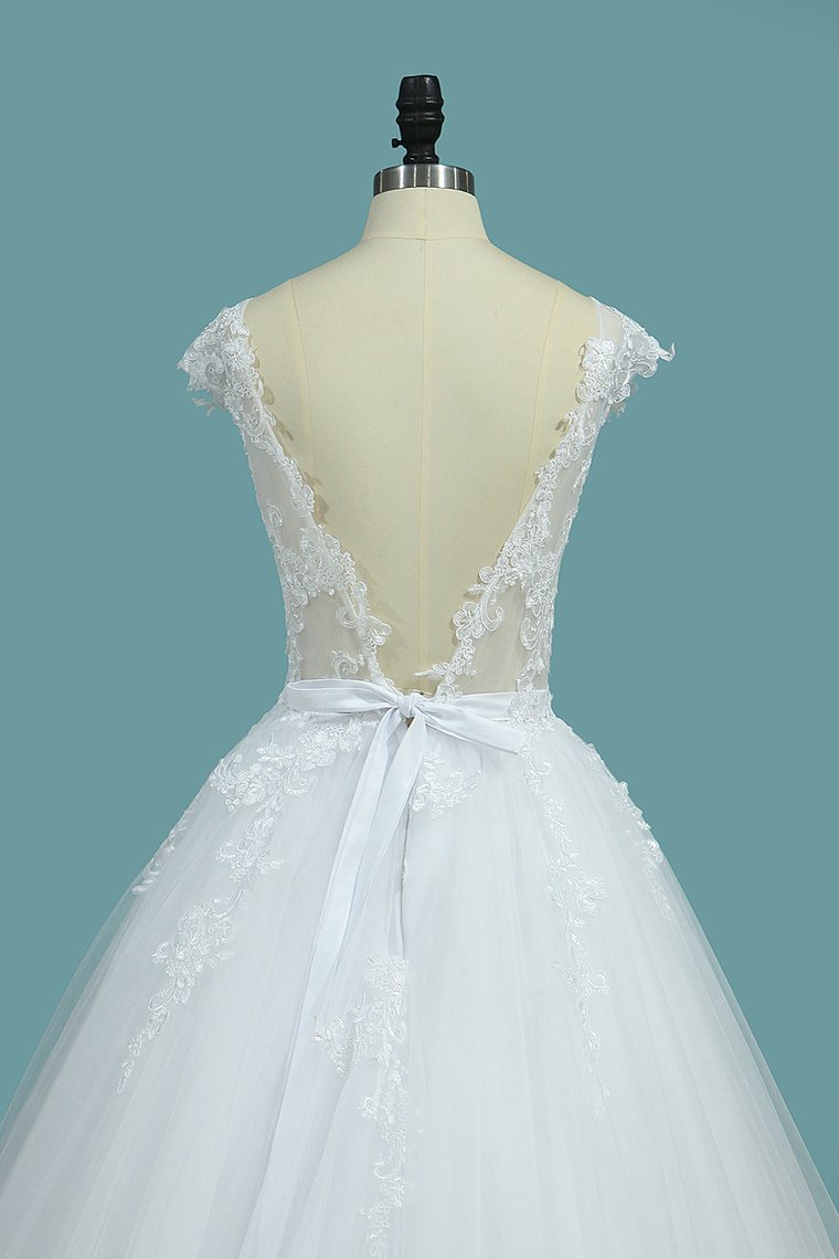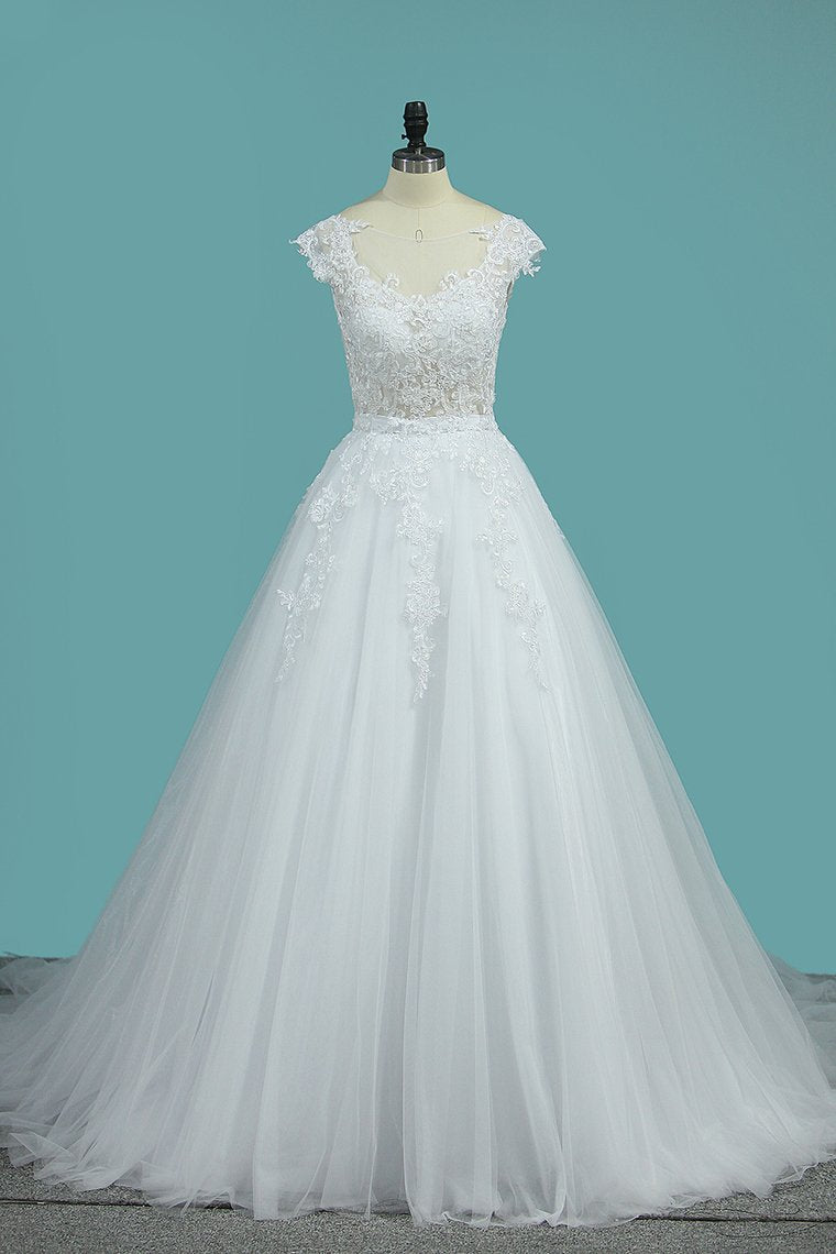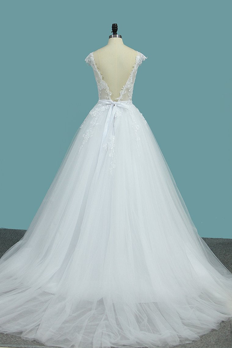 2024 Scoop Open Back Wedding Dresses Tulle With Applique A Line Chapel Train