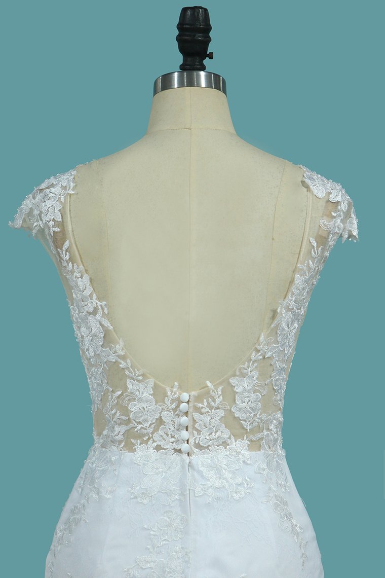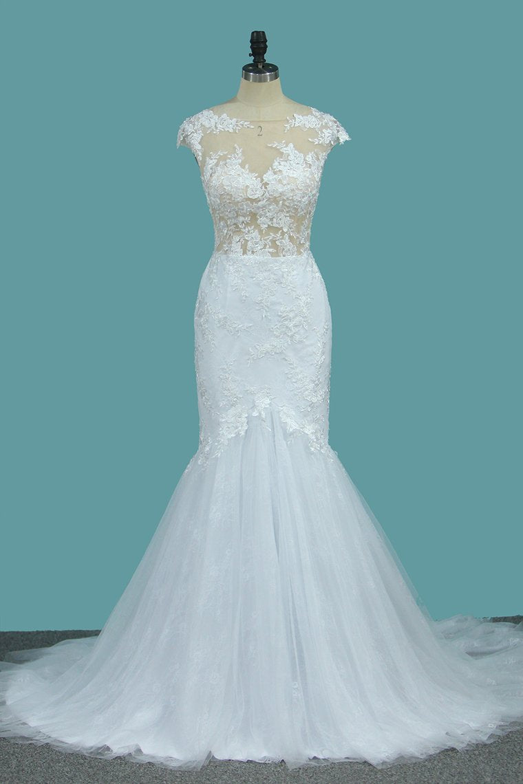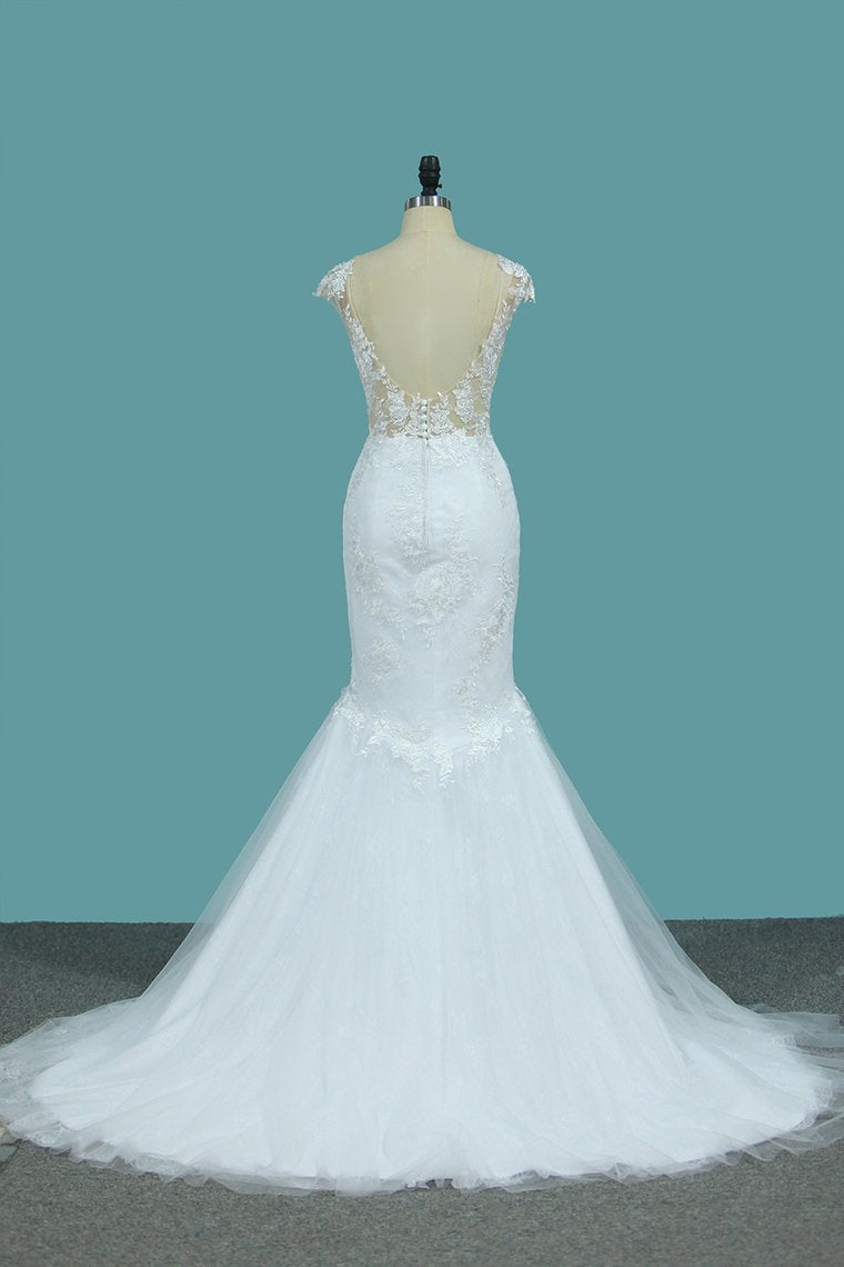 2024 Scoop Tulle Mermaid Wedding Dresses With Applique Sweep Train Open Back