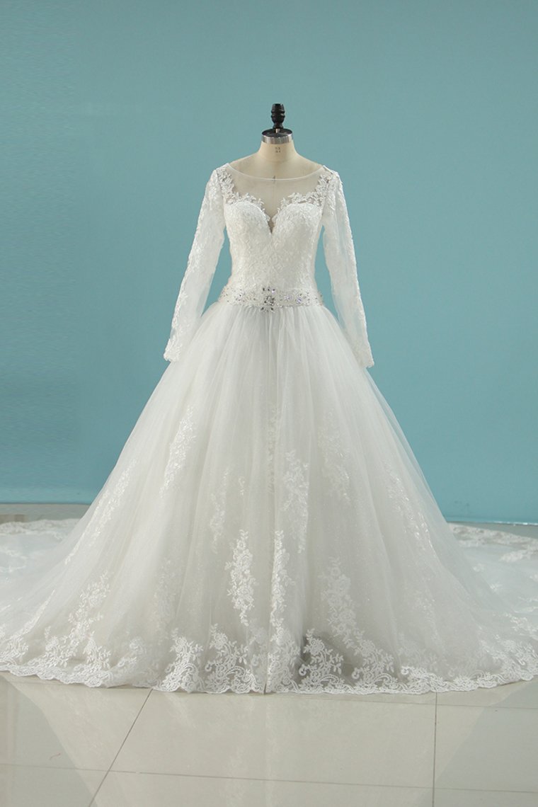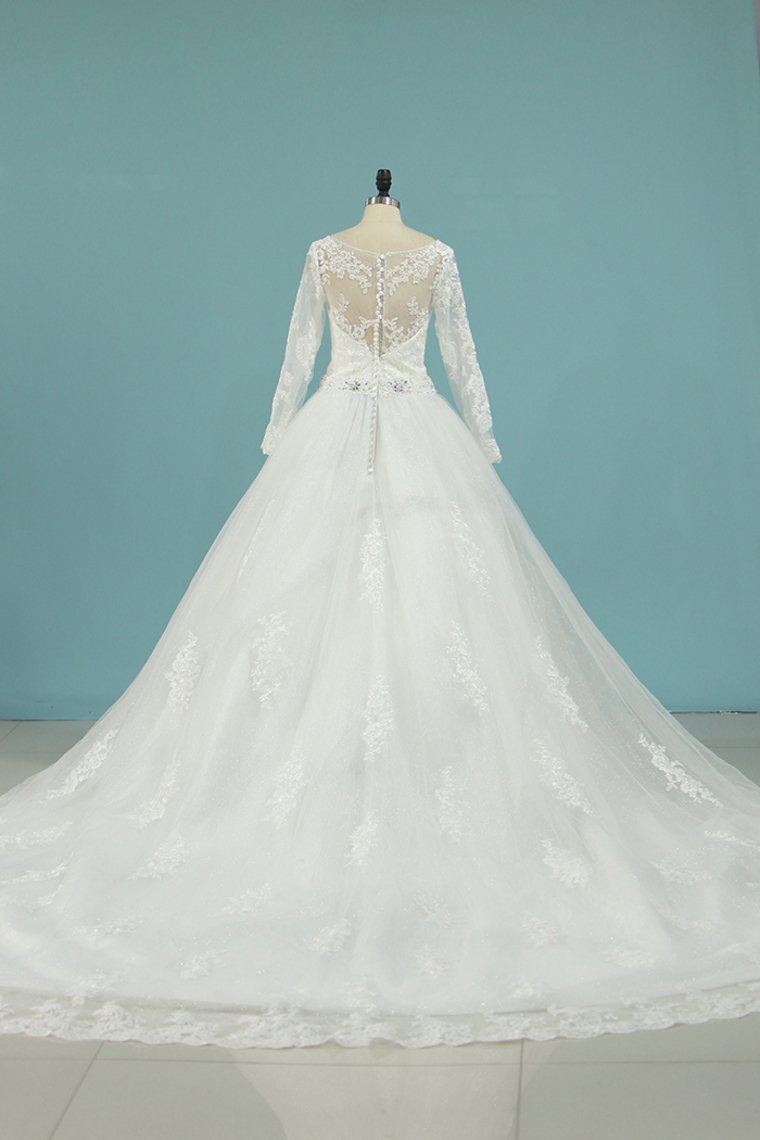 2024 Scoop Wedding Dresses A Line Long Sleeves Tulle Court Train