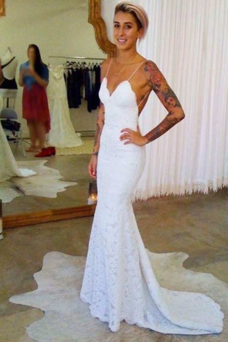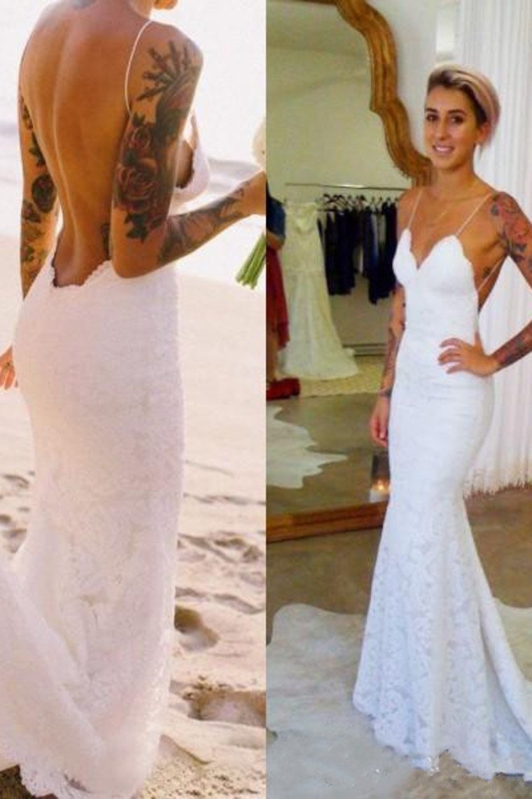 2024 Sexy Spaghetti Straps Open Back Mermaid Lace Beach Wedding Dresses Zipper Up