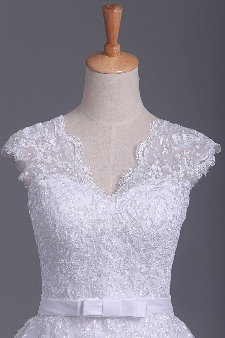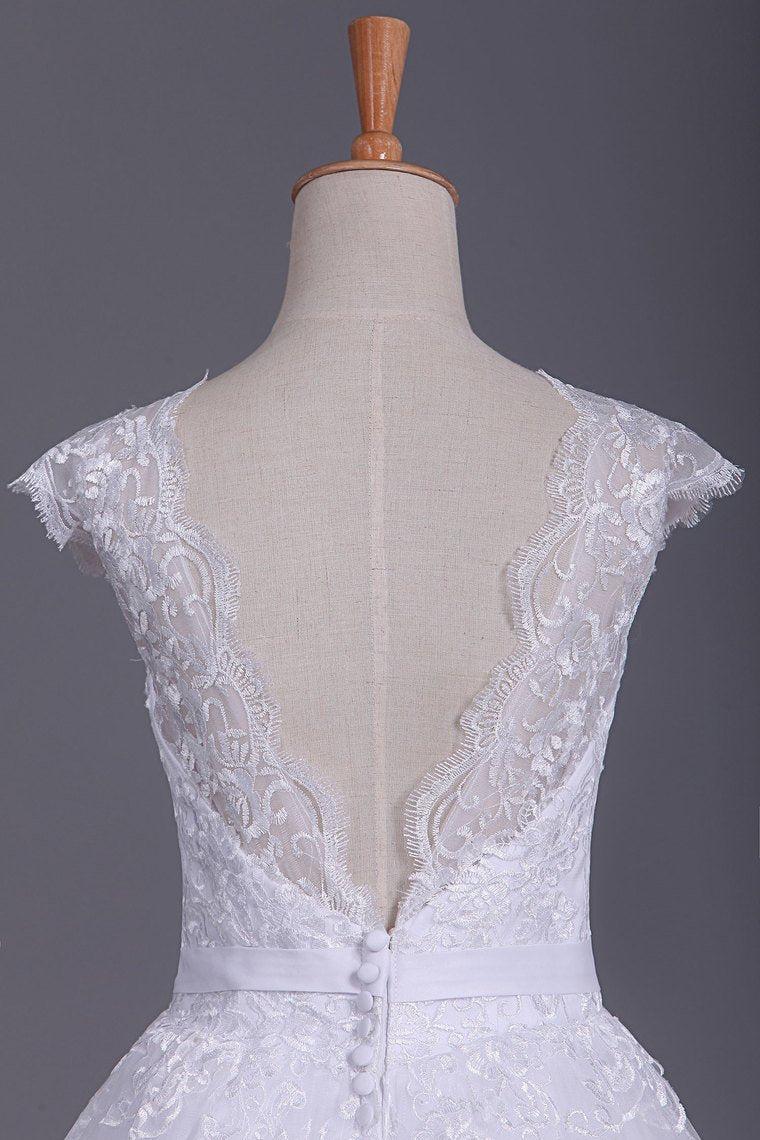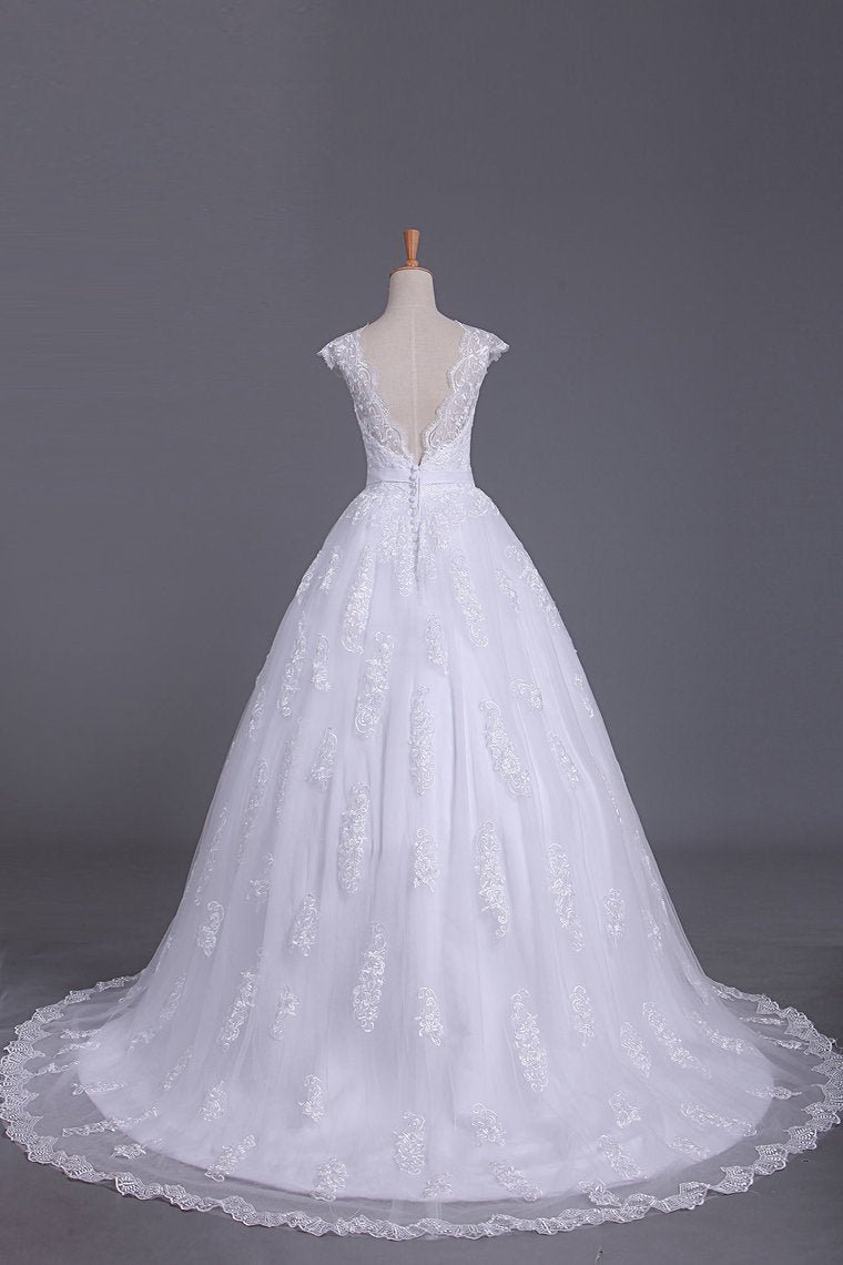 2024 Sexy Wedding Dresses Open Back V Neck A Line Tulle With Applique Chapel Train